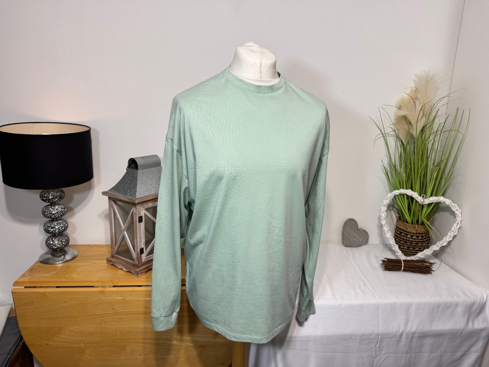 PIT-PIT 26IN. LENGTH 28.5INThe ASOS Mint Oversized Long Sleeve Top in size S is a stylish and comfortable addition to any man’s wardrobe. Made from cotton, this relaxed fit T-shirt features a round neckline and long sleeves, perfect for a casual yet fashionable look. The mint colour adds a fresh and vibrant touch, making it easy to pair with a variety of outfits for everyday wear.R7