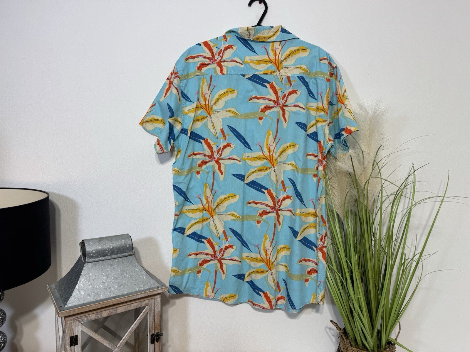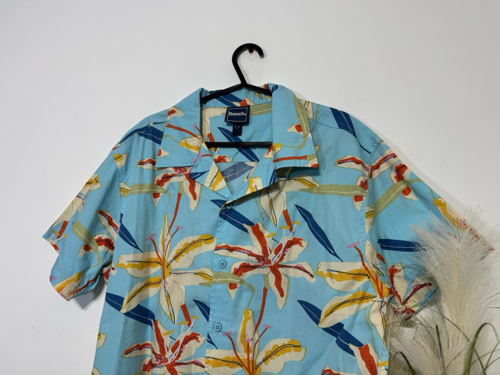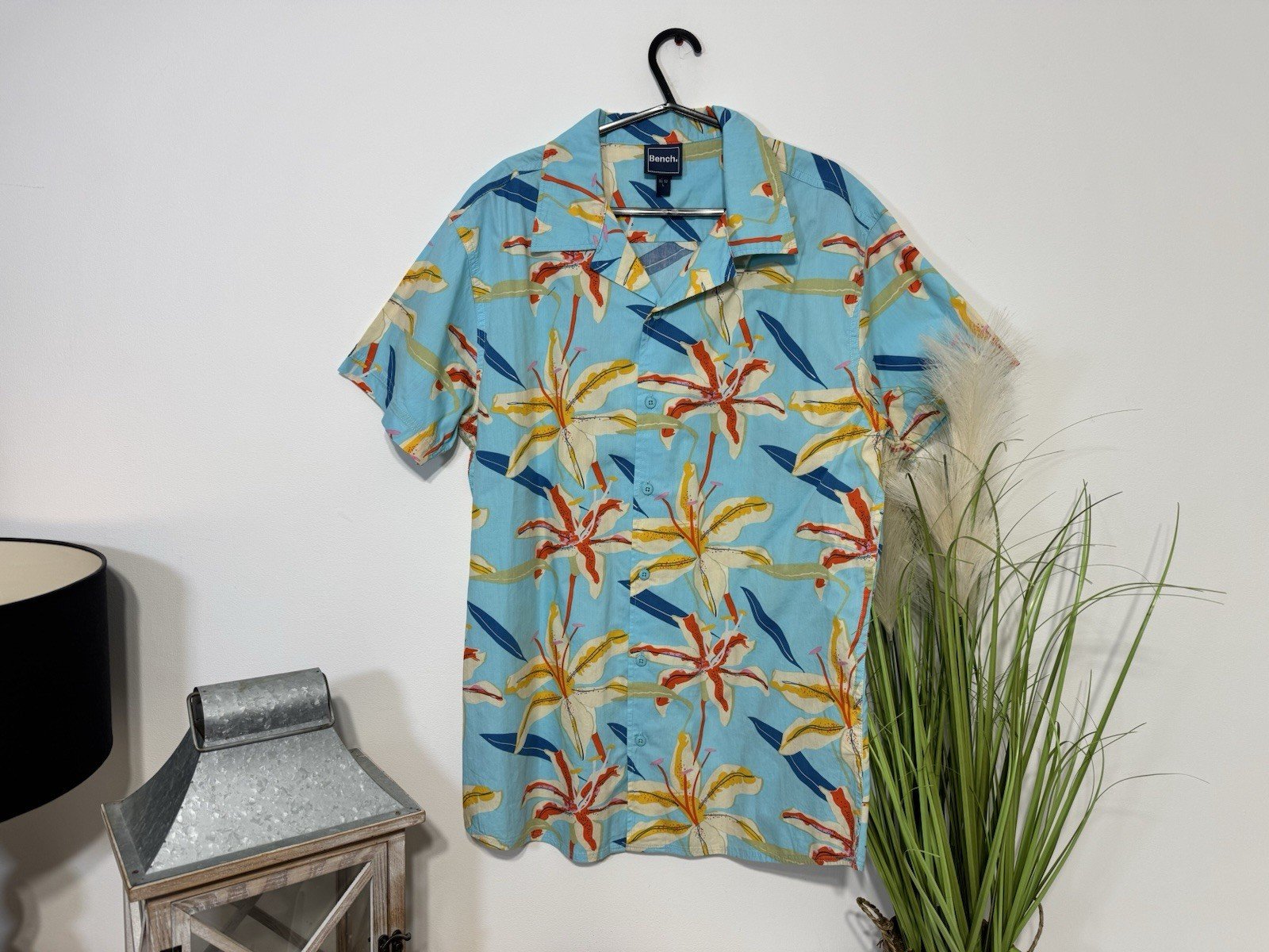 Pit-pit 22”. Length 30”This Bench Sky Blue Cotton Print Short Sleeve Shirt in size L is a stylish addition to any man’s wardrobe. The floral pattern and collared neckline give it a casual yet put-together look, perfect for summer occasions. Made from comfortable cotton material, this button-up shirt is easy to care for with its machine washable design. The regular fit and cutaway collar style add a touch of sophistication, making it a versatile option for everyday wear.