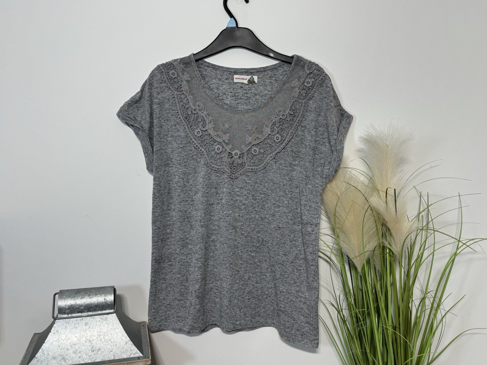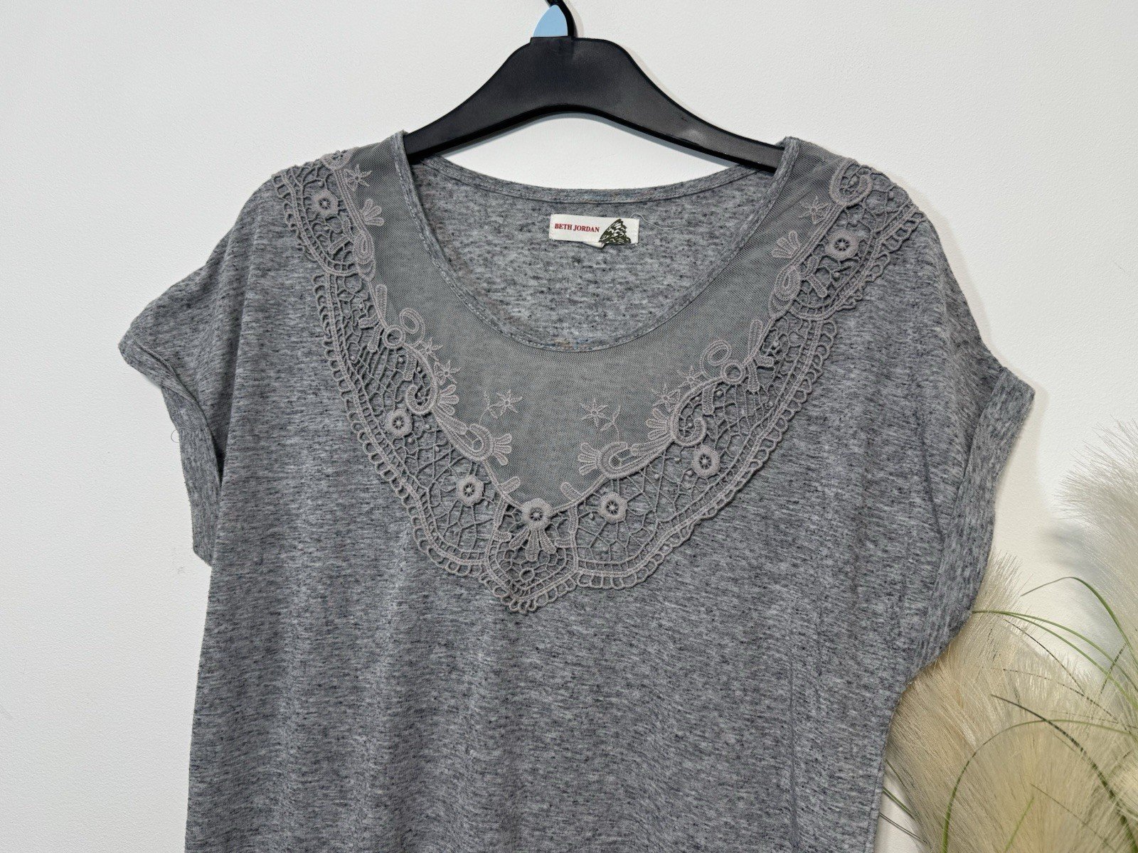 The Beth Jordan Lace Effect Yolk Top in size M is a stylish and versatile option for casual occasions. Made from a comfortable cotton blend material, this blouse features short sleeves, a round neckline, and a regular fit. The grey colour adds a touch of elegance, while the Beth Jordan brand ensures quality and style. Perfect for women who are looking for a basic yet chic addition to their wardrobe.