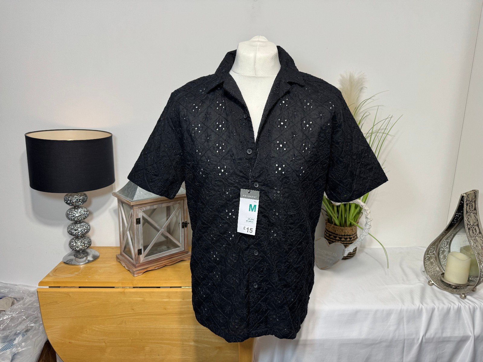 PIT-PIT 23IN.  LENGTH 28.5INThis black broidery anglaise open neck relaxed fit shirt in size M is from the brand Primark and is designed specifically for men. The shirt features a collared neckline, short sleeves, and a regular size fit. The open neck adds a stylish touch to the classic design of this t-shirt, making it a versatile and trendy addition to any wardrobe.R9