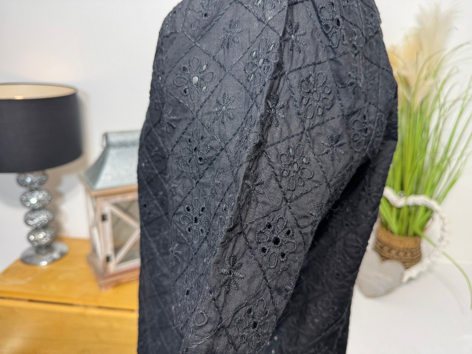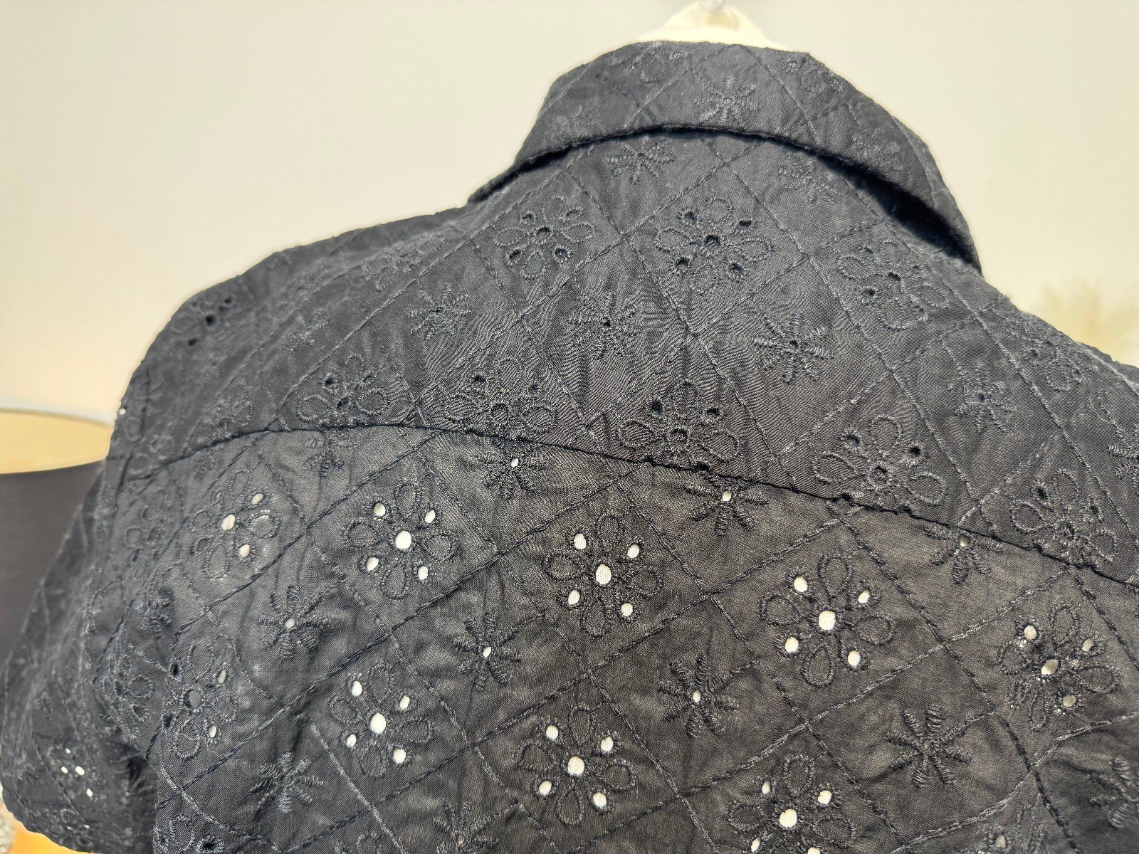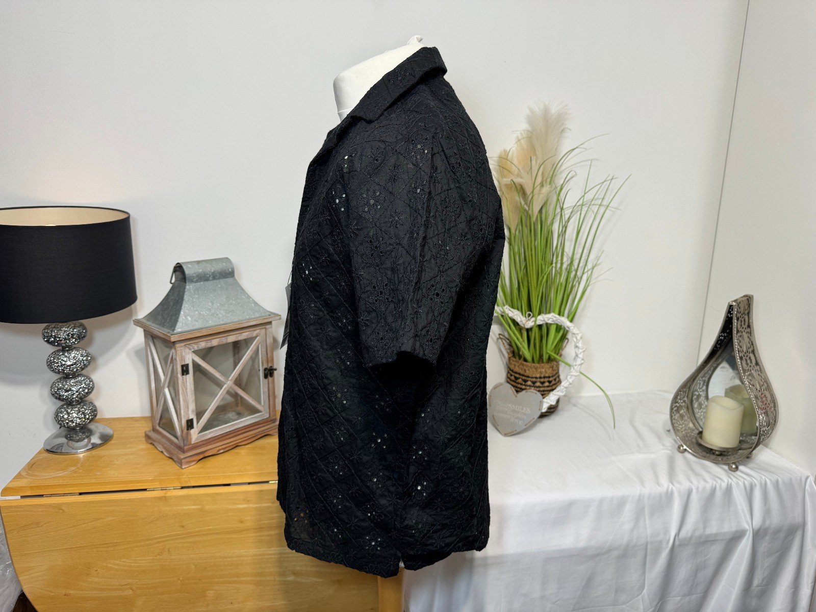 Black Broidery Anglaise Open Neck Relaxed Fit Shirt Size M