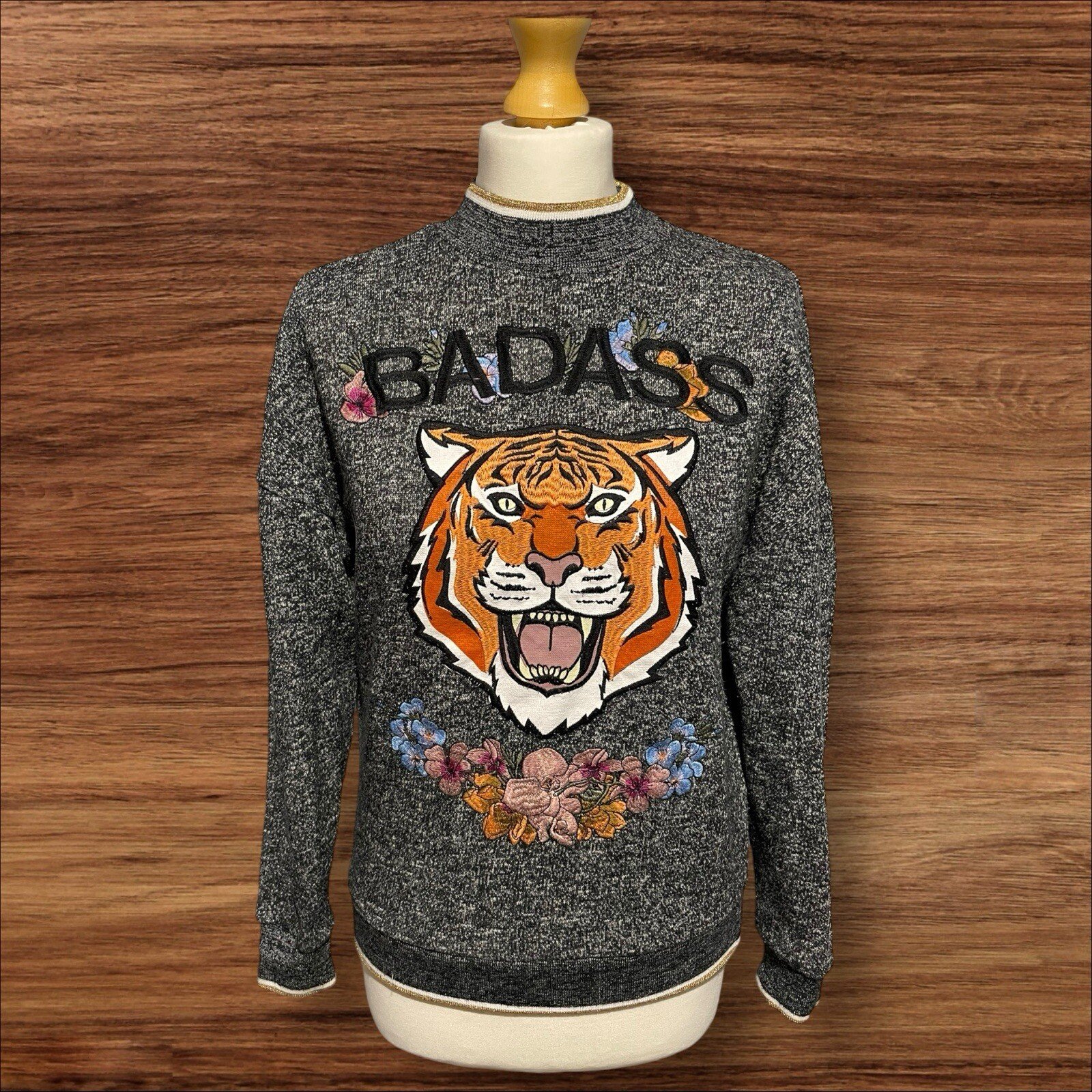 Black Fleck Sweatshirt With Tiger Front Motif Round Collar/cuff Detail Size S