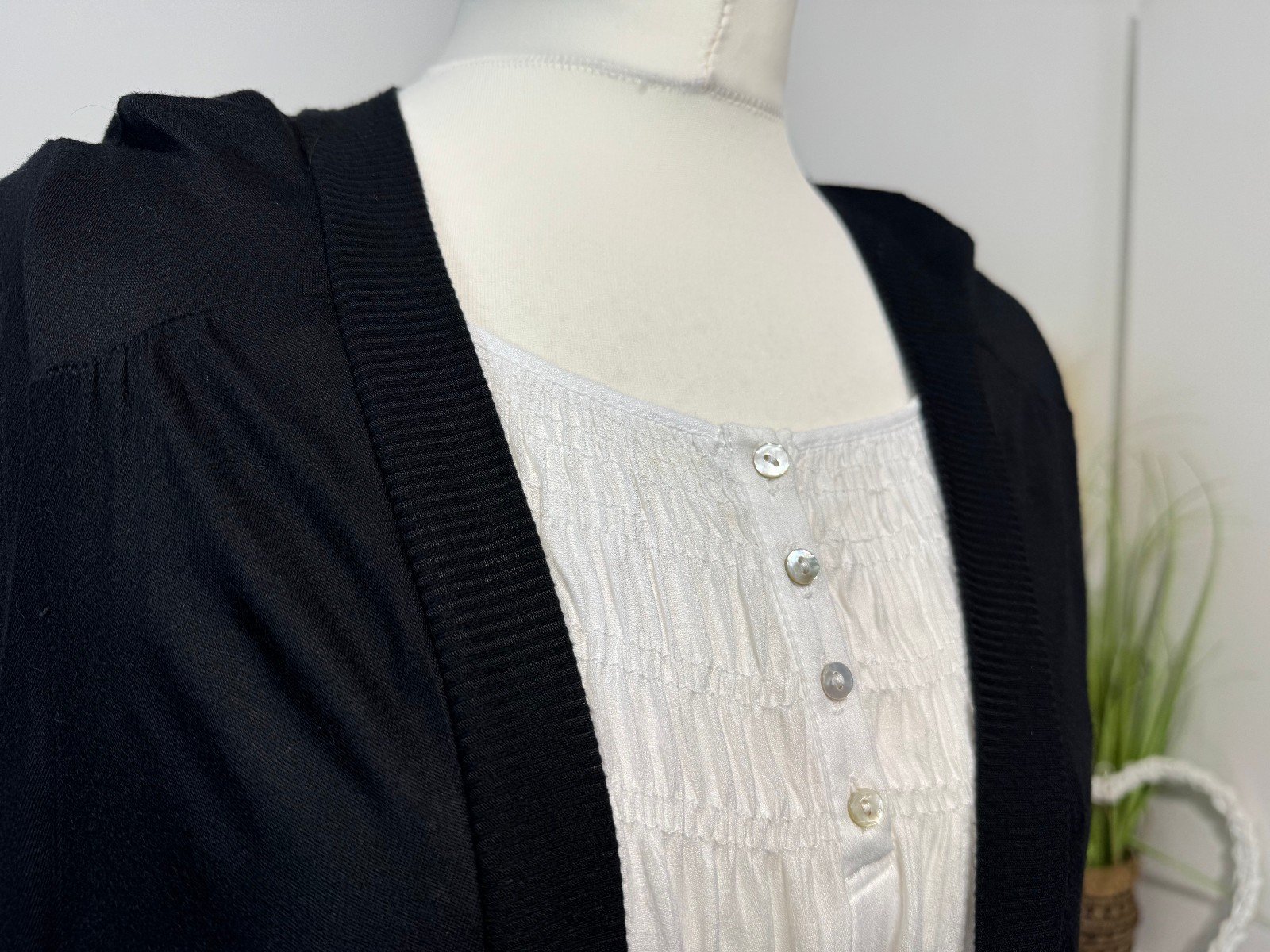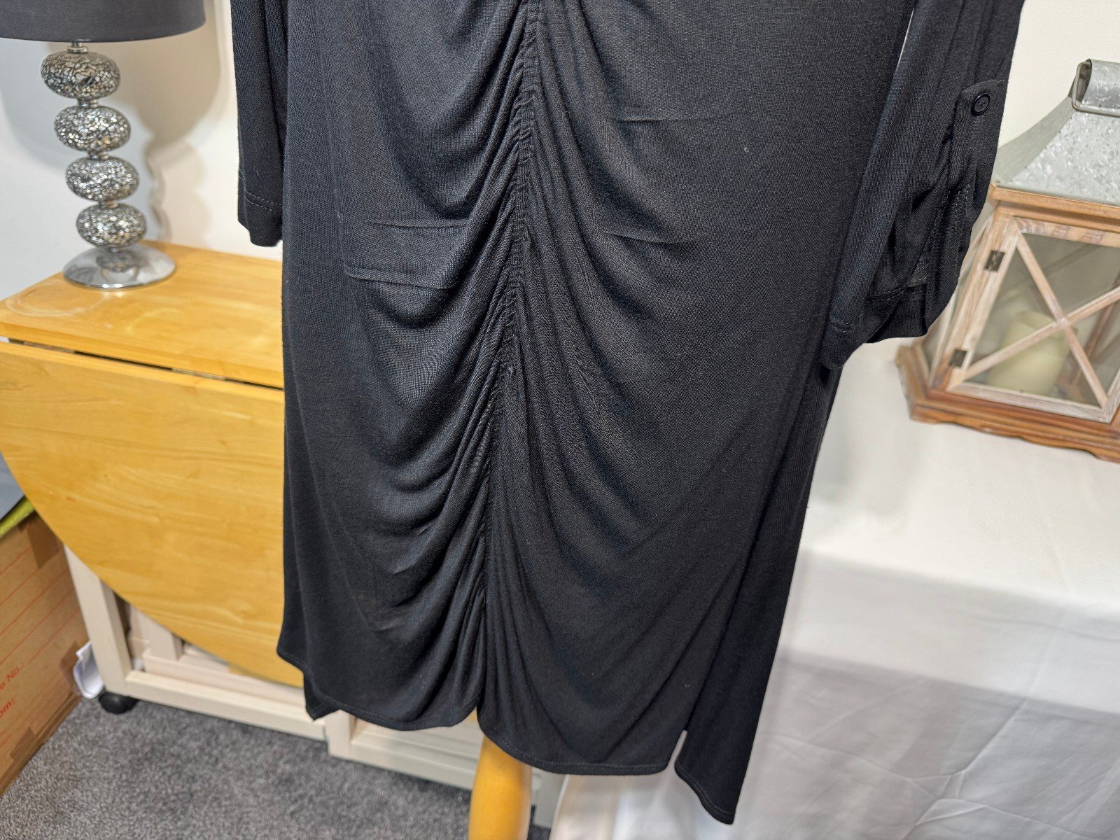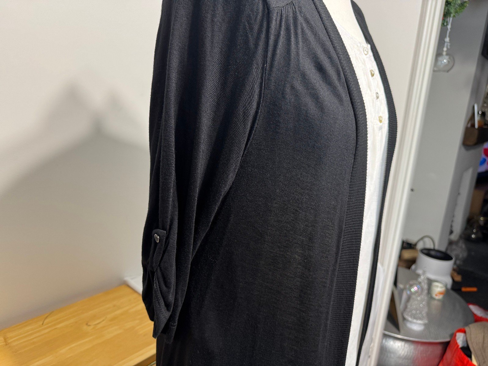 PIT-PIT 21IN. LENGTH 40INThis black longline cardigan with a ruched back, size 12, from brand E is a stylish and versatile piece for women. Featuring a collarless neckline and 3/4 sleeves, this cardigan is made from jersey fabric, offering a comfortable and chic addition to any wardrobe. Perfect for layering over a variety of outfits, this cardigan is a must-have for any fashion-conscious individual looking for a sophisticated and effortless style.