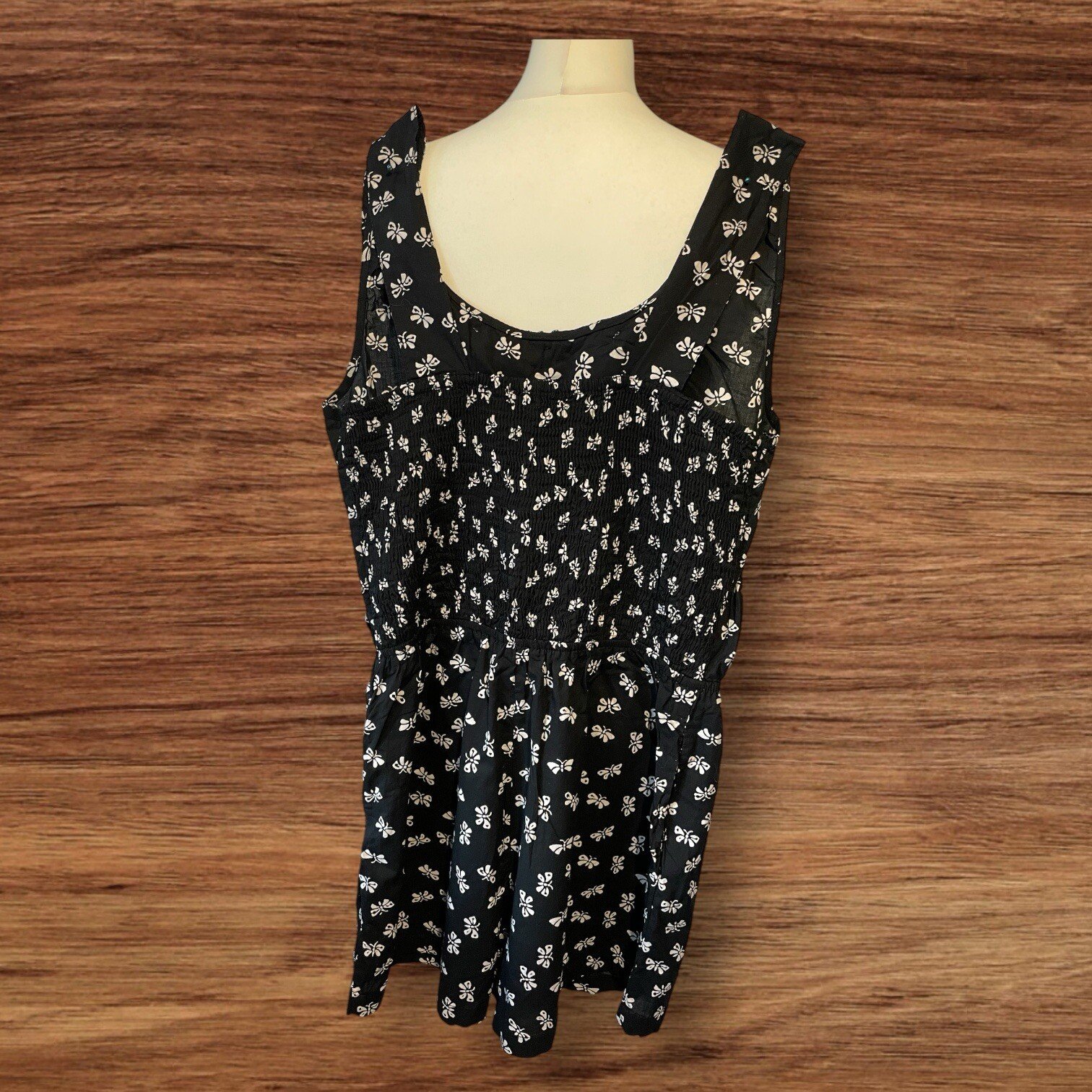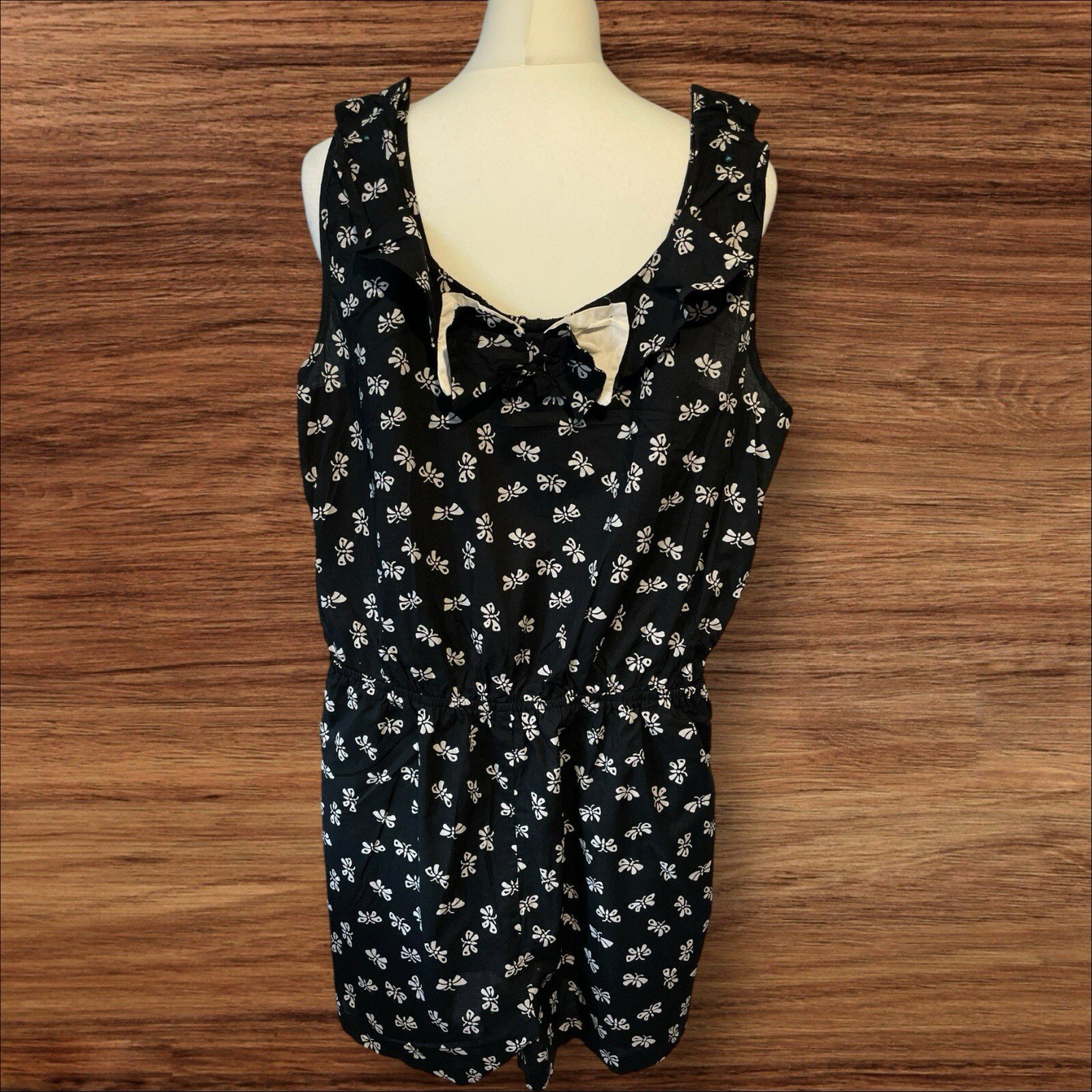 Embrace the summer breeze with this stylish black playsuit featuring a beautiful white butterfly pattern. The frill neck and bow accent add a touch of femininity to this sleeveless one-piece. Perfect for any occasion, this playsuit is made from 100% cotton, ensuring maximum comfort throughout the day. The elastic back bodice provides a flattering fit for women size S16. The playsuit is designed with a butterfly theme and accents that include a bow. The black colour of the playsuit is perfect for any summer outfit. This playsuit is a must-have addition to your wardrobe and is perfect for a day out in the sun. Excellent condition From a smoke and pet free home