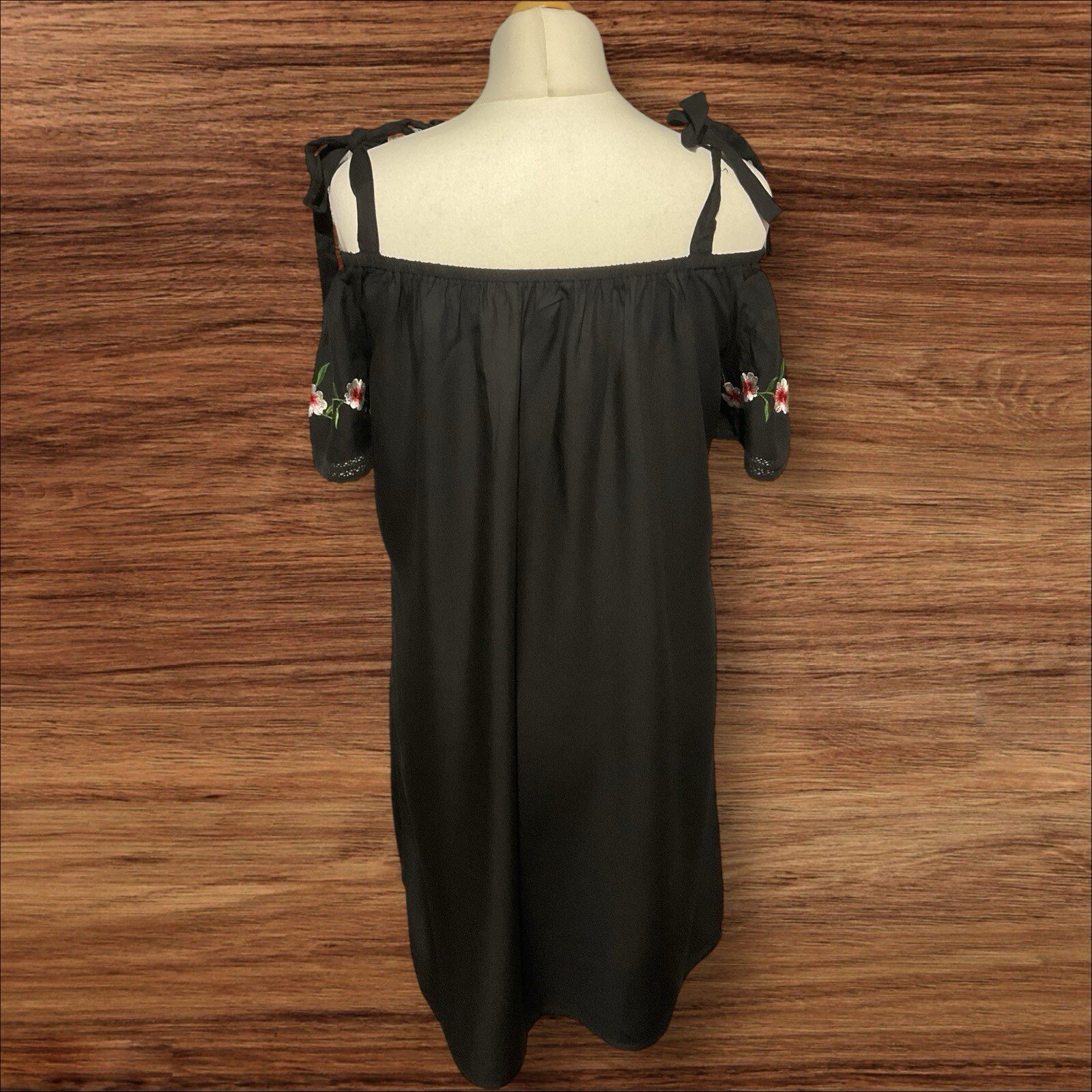 Elevate your style with this stunning black strap dress from George. The off-the-shoulder neckline and embroidered floral accents add a touch of elegance to this knee-length slip dress. The short sleeves and straps make it perfect for any occasion, whether it's a formal event or a night out with friends. Crafted from high-quality viscose, this dress is comfortable to wear and easy to care for. The drop sleeve design and hem detailing add a touch of sophistication to this classic piece. Available in size 10, this dress is perfect for any woman who wants to look and feel her best. Excellent condition From a smoke and pet free home