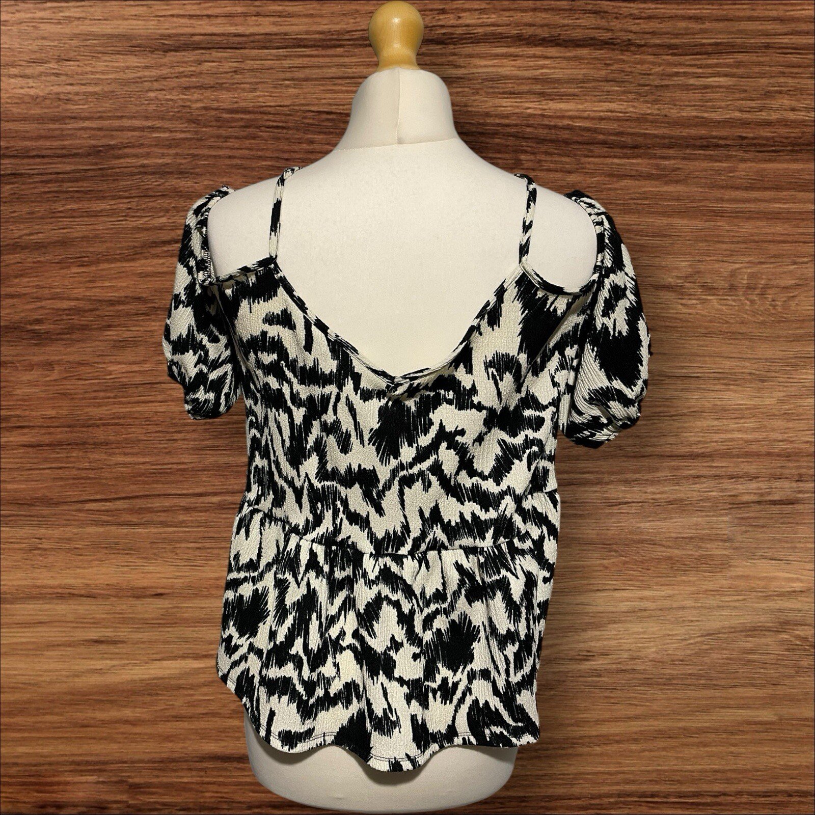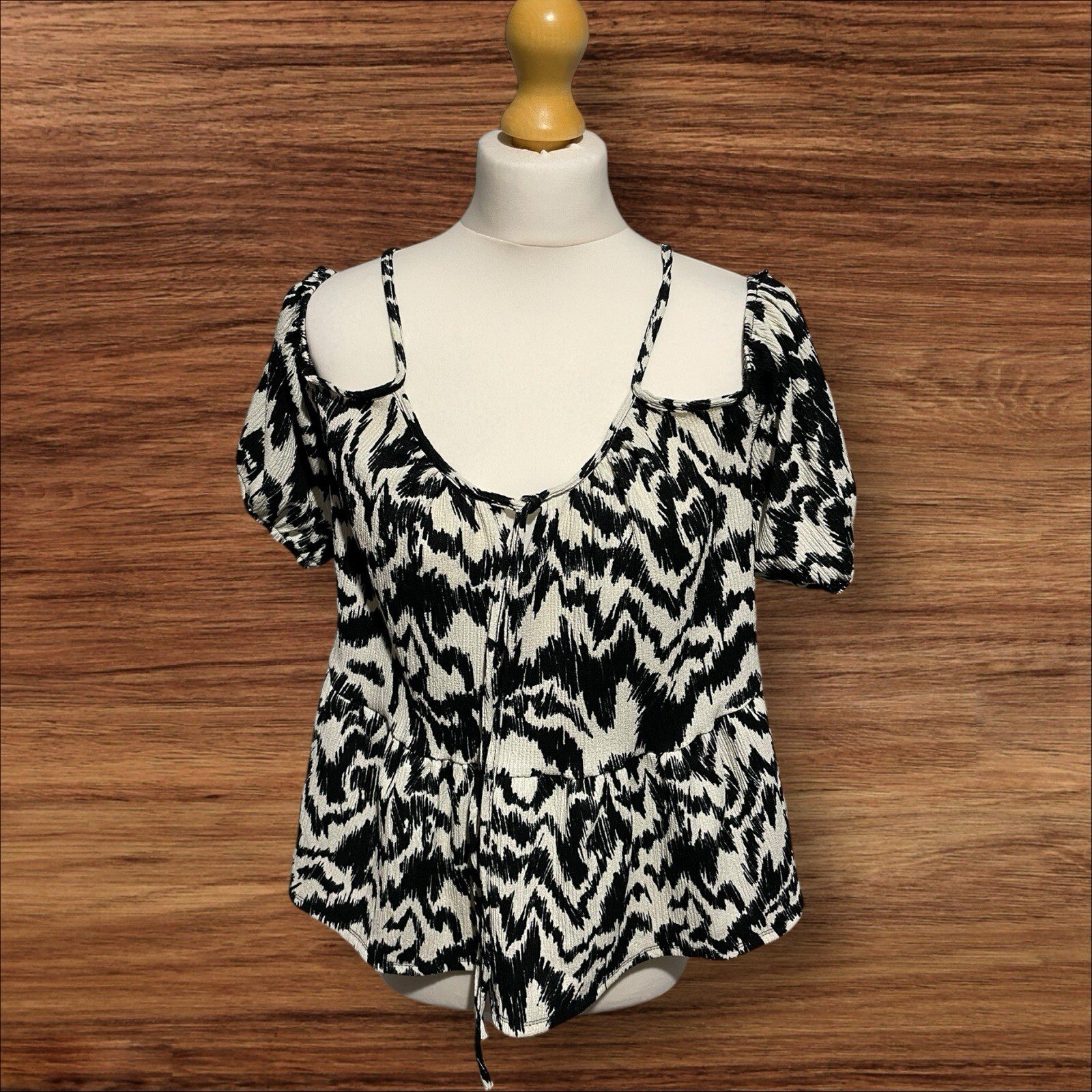 Add a stylish touch to your wardrobe with this black and white patterned blouse from George. The off-the-shoulder neckline and puff sleeves with frill hem add a feminine touch to the relaxed fit. The blouse is made of a comfortable blend of polyester and elastane, making it perfect for all-day wear. The straps provide an accent to the overall design, making it a great addition to any outfit. This blouse is available in size 16 and is perfect for any occasion. Excellent condition From a smoke and pet free home