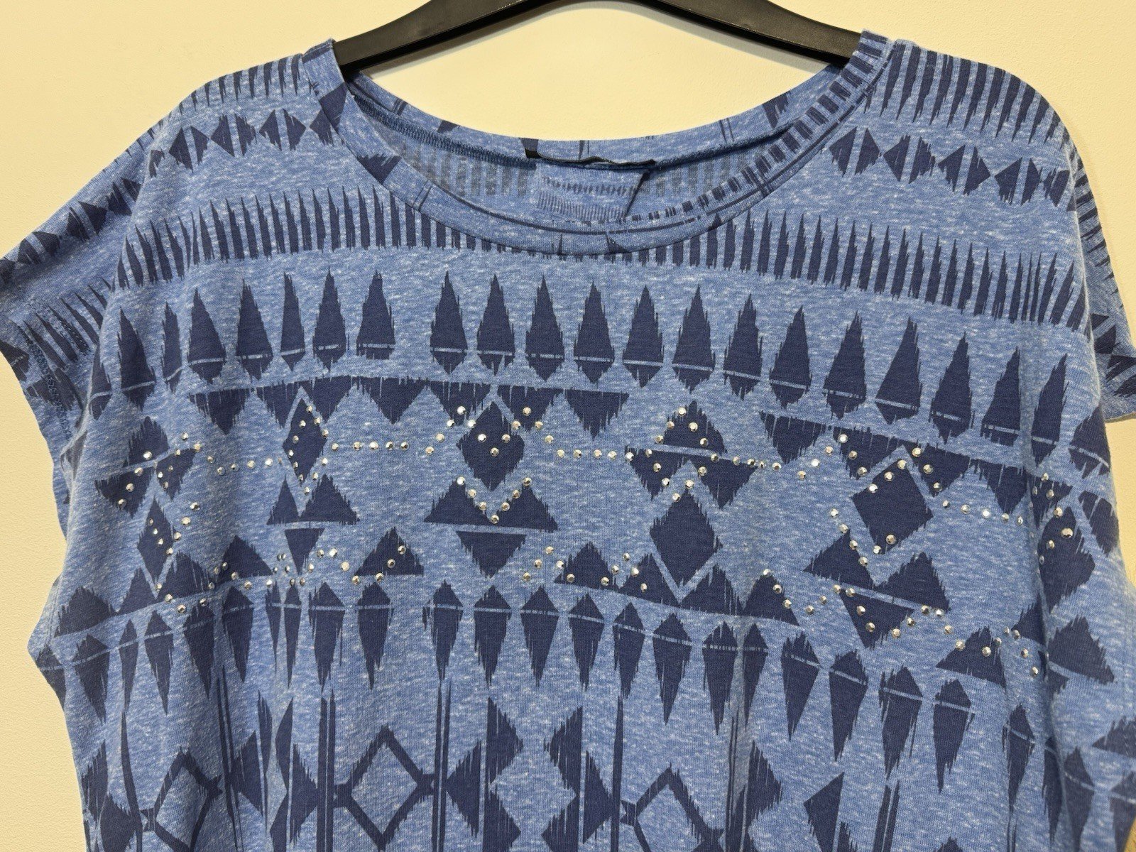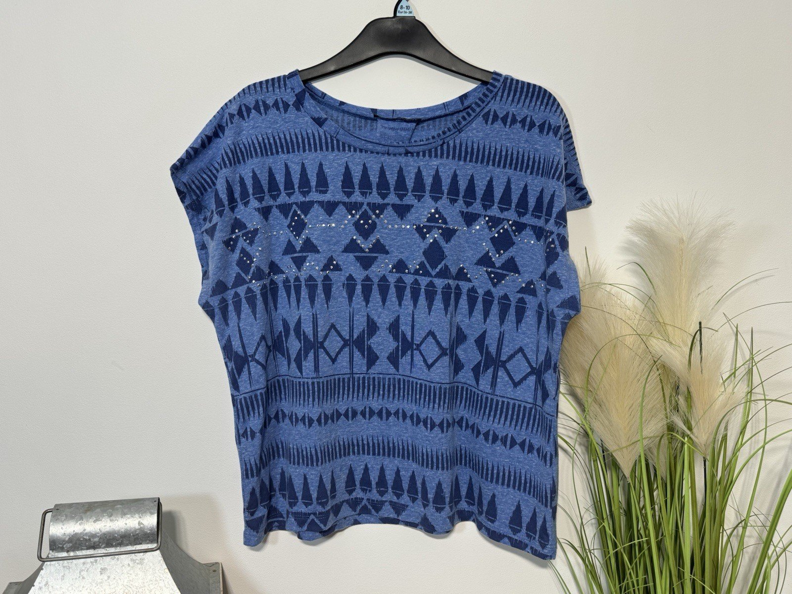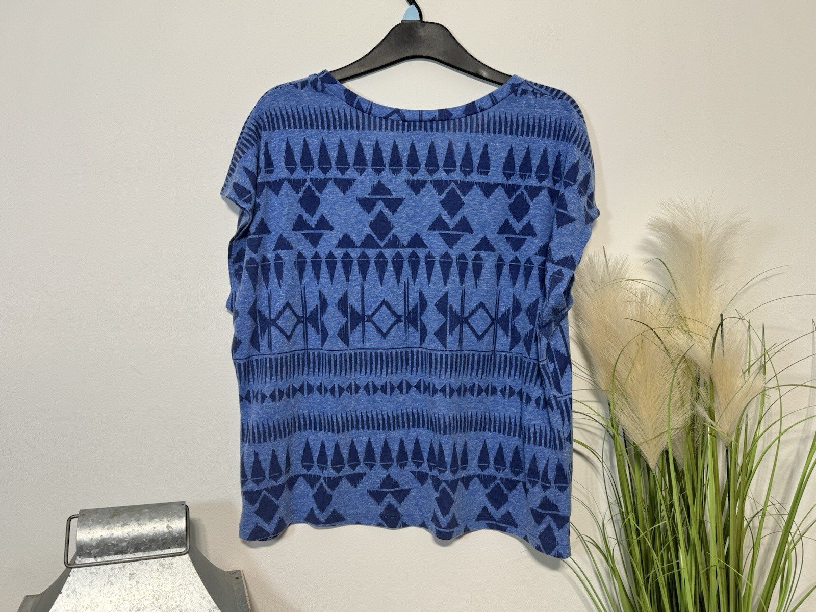 This Blue Aztec Print Cap Sleeve Top in size 12 is a stylish and versatile addition to any woman’s wardrobe. Made from viscose material, it features a regular fit and a pullover style with a round neck. The top is perfect for casual occasions and can be easily cared for with machine washing. The Aztec print adds a trendy touch to the classic blue colour, making it a standout piece from the Atmosphere brand. Perfect for a comfortable and fashionable look.