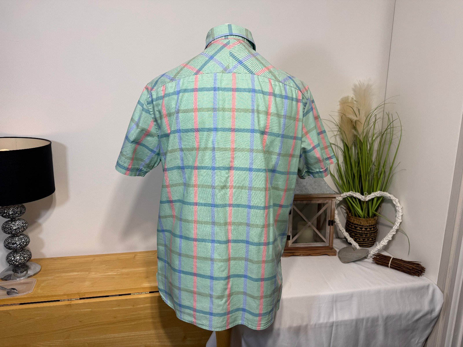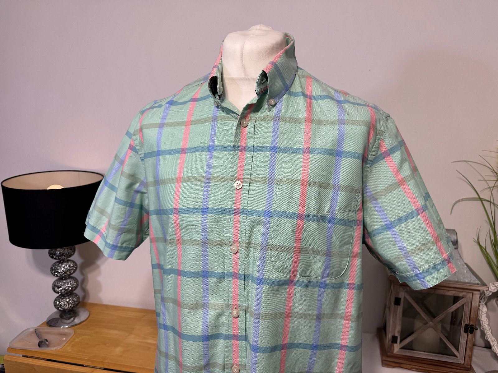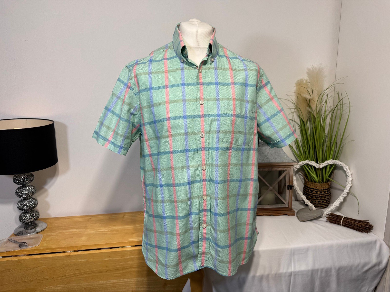 PIT-PIT 23IN. LENGTH 30 INThe Blue Harbour Luxury Fabric Check Short Sleeve Shirt in size L is a stylish and sophisticated addition to any man’s wardrobe. Made from a blend of cotton and lyocell, this shirt features a classic button-up design with a collared neckline and short sleeves. The mint colour and printed buttons add a touch of elegance, making it perfect for casual occasions. This shirt is machine washable for easy care and has a regular fit for a comfortable and flattering look. The Blue Harbour brand ensures quality and style in this wardrobe essential.ref5