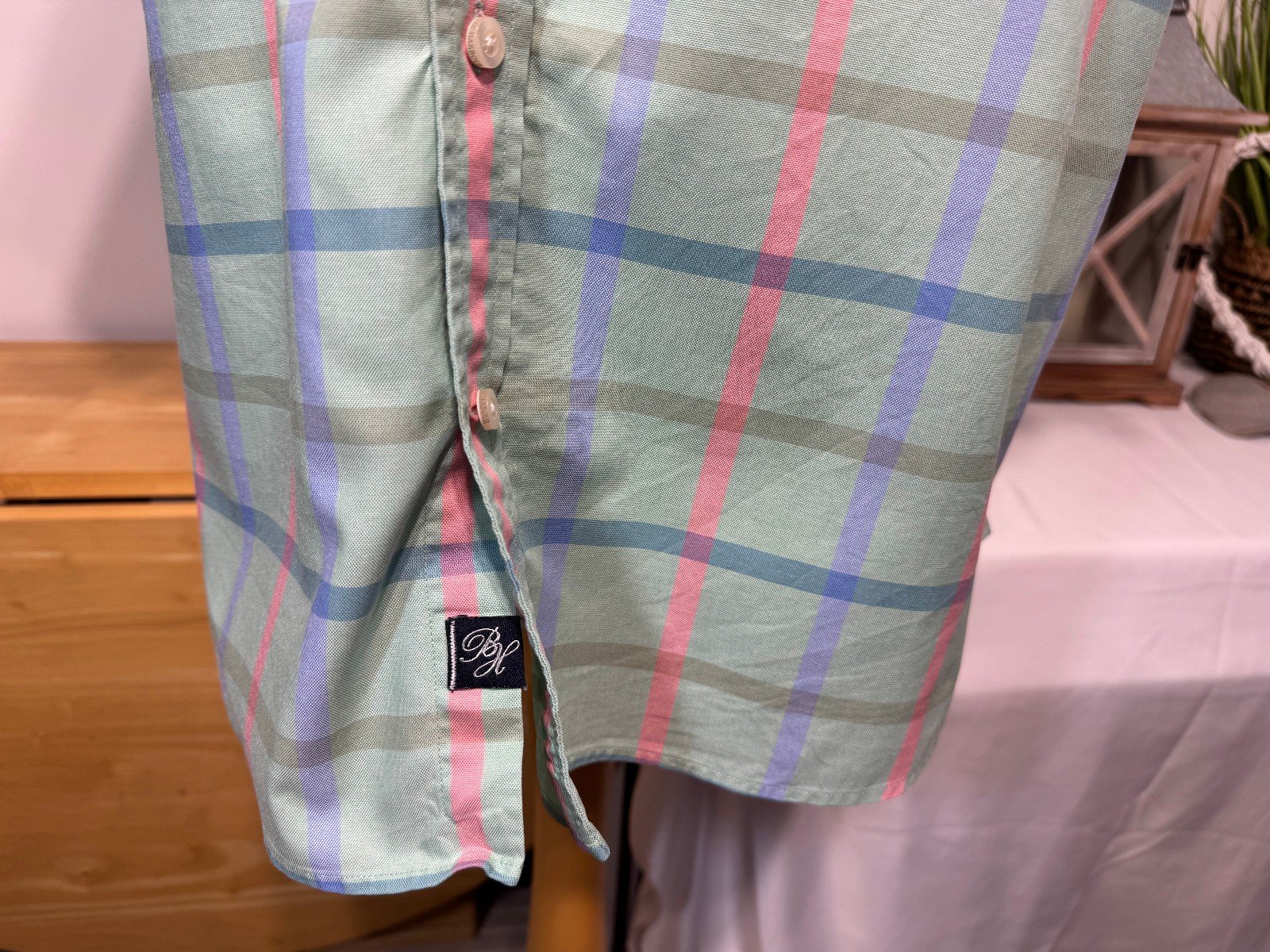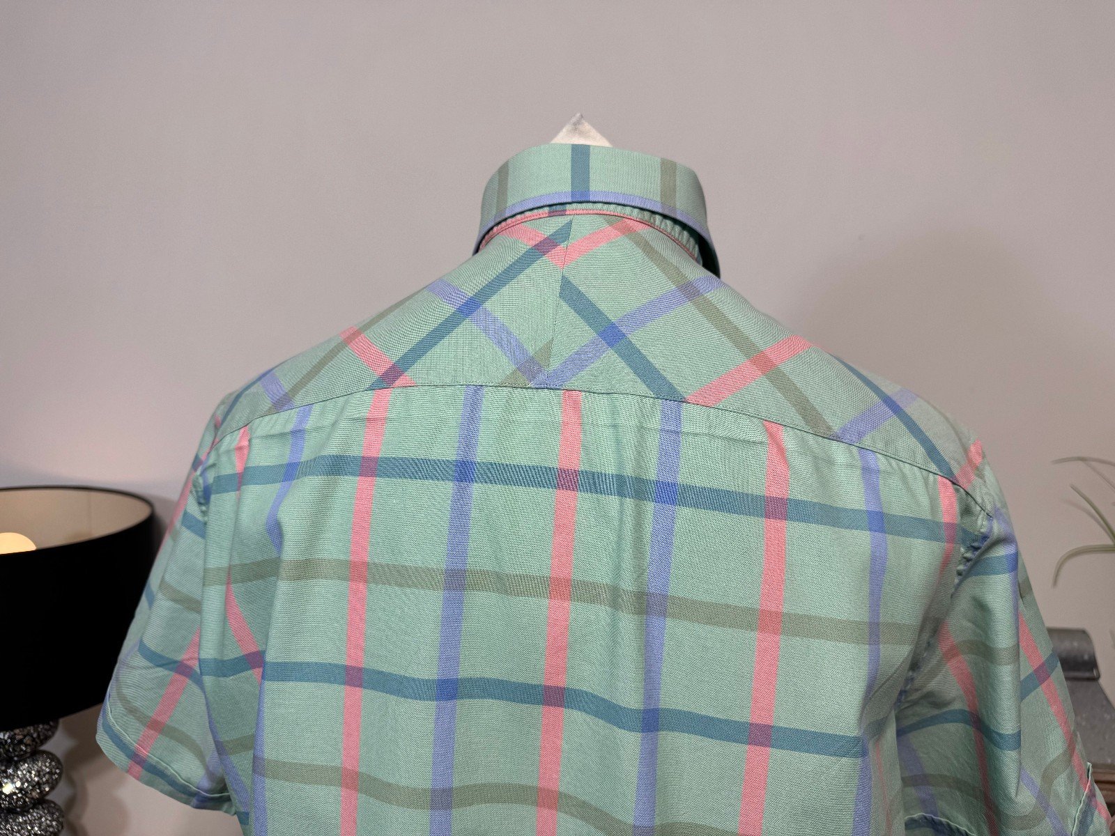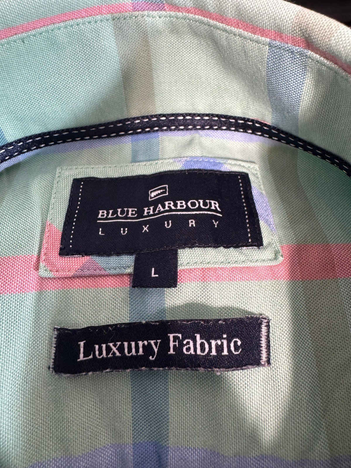 PIT-PIT 23IN. LENGTH 30 INThe Blue Harbour Luxury Fabric Check Short Sleeve Shirt in size L is a stylish and sophisticated addition to any man’s wardrobe. Made from a blend of cotton and lyocell, this shirt features a classic button-up design with a collared neckline and short sleeves. The mint colour and printed buttons add a touch of elegance, making it perfect for casual occasions. This shirt is machine washable for easy care and has a regular fit for a comfortable and flattering look. The Blue Harbour brand ensures quality and style in this wardrobe essential.ref5