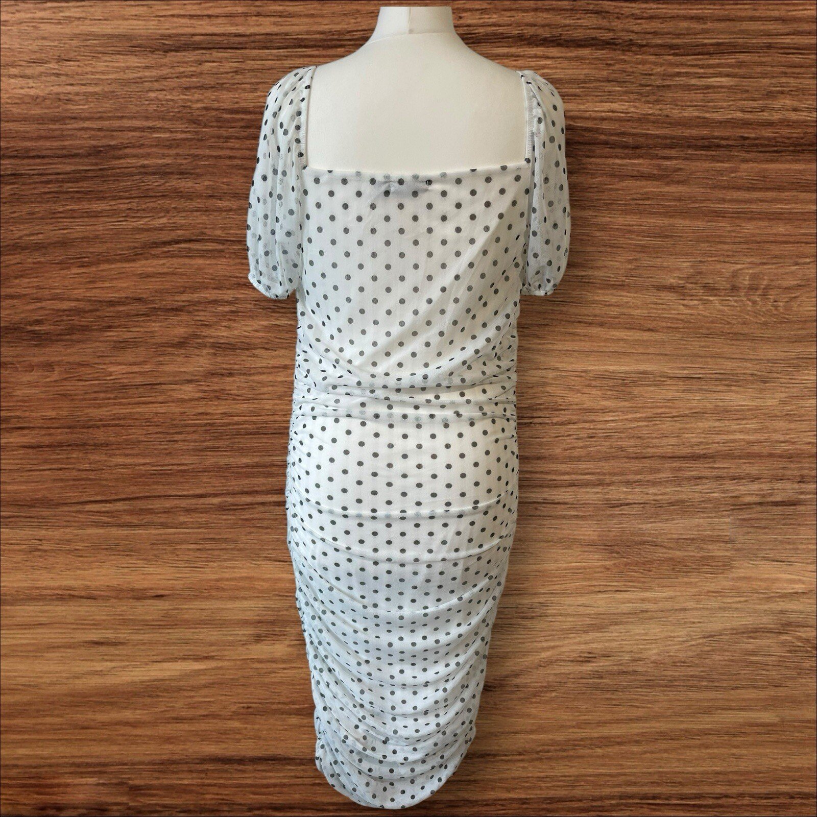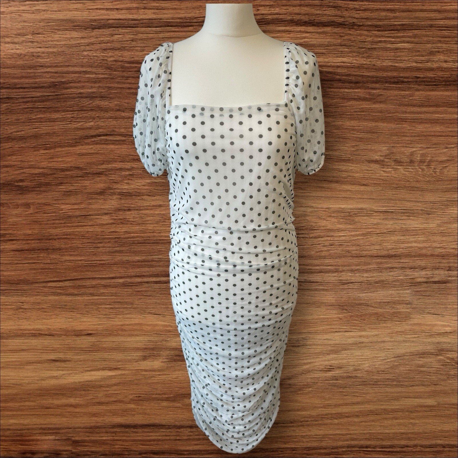 Elevate your wardrobe with this stunning Boohoo dress, perfect for any occasion. The white netted design with black polka dot detailing adds a touch of elegance, while the square neckline and puff sleeves give a stylish and modern twist. The dress features a lined interior and ruched sides for a comfortable and flattering fit. This dress is a must-have for any fashion-forward woman, with its size 14 regular fit and midi length. Made with a blend of polyester and elastane, it is both durable and comfortable to wear. Whether you're dressing up for a special event or looking to make a statement in your everyday life, this Boohoo dress is the perfect addition to your wardrobe. Excellent condition From a smoke and pet free home