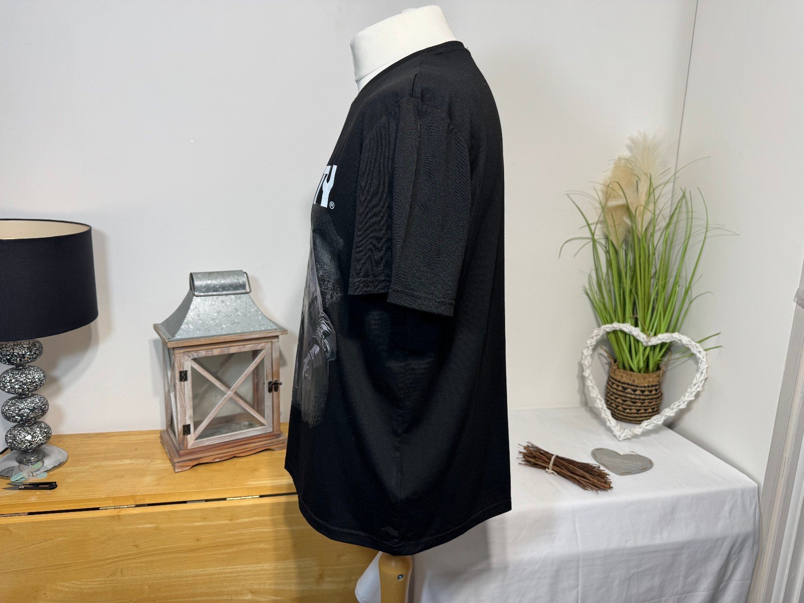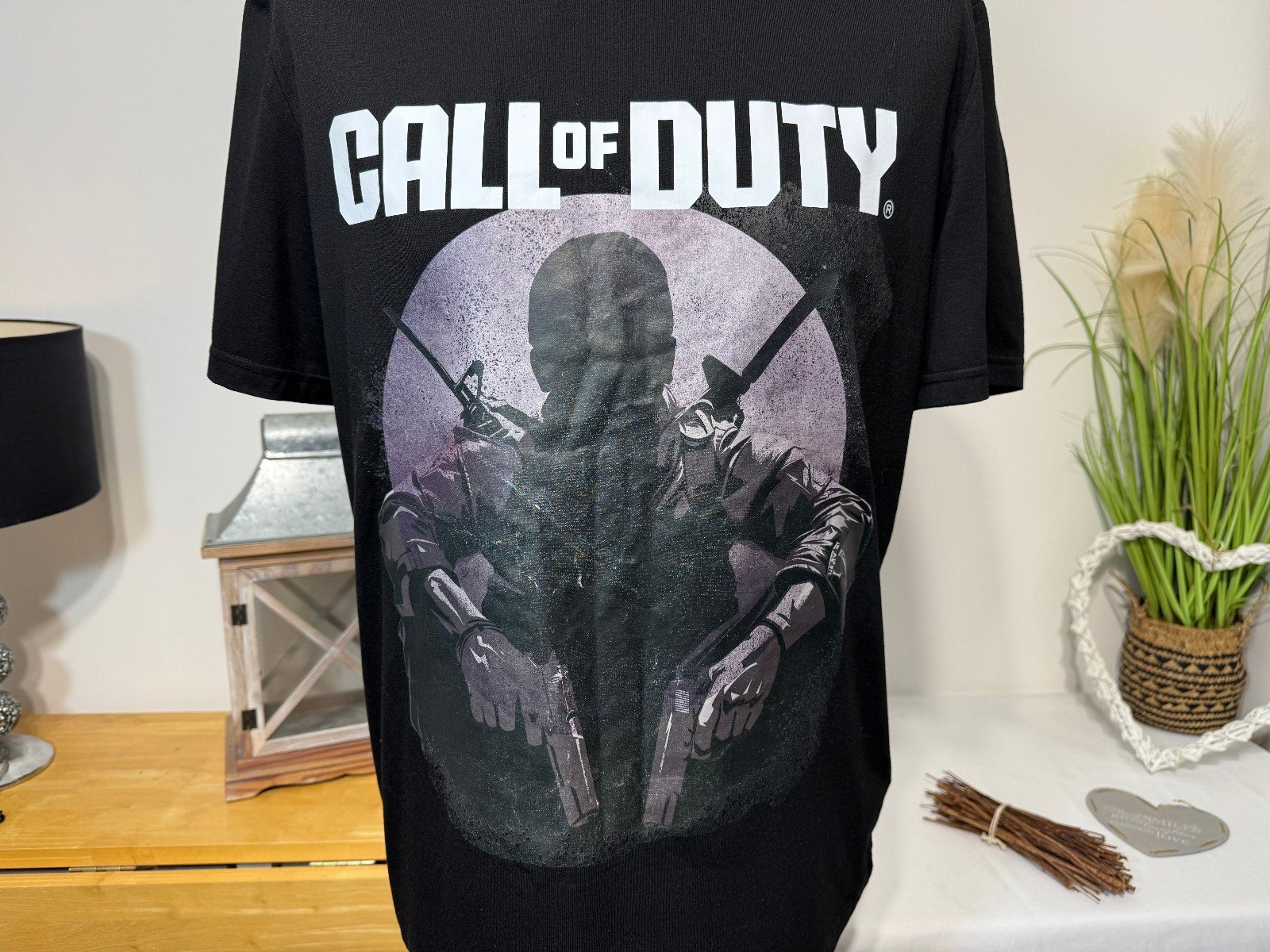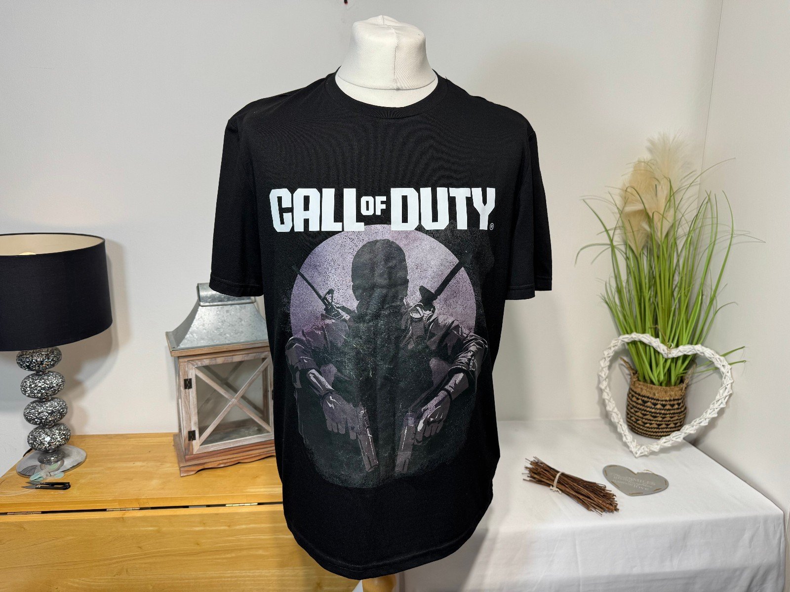PIT-PIT 23″. LENGTH 28″This Call Of Duty Black Graphic T-Shirt in size L is a stylish and comfortable option for men’s casual wear. The short sleeve tee features a round neckline, and is made from a blend of polyester, viscose, and elastane in a jersey fabric type. The black colour and graphic print accents, including the logo, add a trendy touch to the regular fit shirt from the brand SheIn. Perfect for relaxing or lounging, this machine washable T-Shirt is a must-have for any gaming enthusiast.R11
