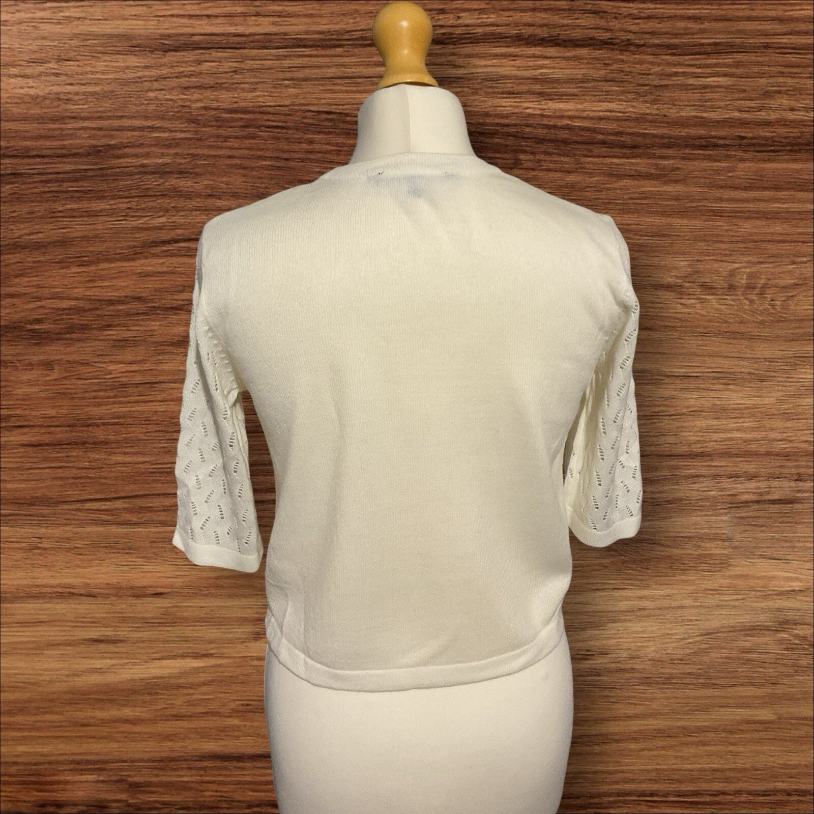 Add a touch of elegance to your wardrobe with this beautiful cream bolero from Peacocks. The patterned arms and front add a unique touch to this classic piece, while the plain back gives it a timeless appeal. Made from high-quality acrylic material, this bolero is perfect for any occasion, whether you're dressing up for a formal event or adding a touch of sophistication to your everyday look. This bolero is a size 10 and is designed to fit regular size types. The open neckline adds a touch of elegance to the piece, while the stylish bolero style enhances your overall look. Perfect for any woman who wants to add a touch of class to her wardrobe, this cream bolero is a must-have. Excellent condition From a smoke and pet free home