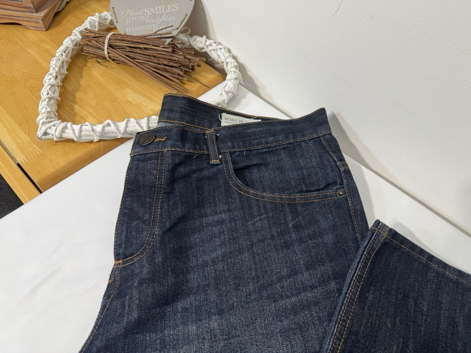 These Dark Blue Button Close Straight Fit Denim Jeans by Denim & Co. are a wardrobe essential for any man. Made from cotton denim with a mid-rise, they feature a classic 5-pocket design and a zip closure. The straight fit and size W38 L30 ensure a comfortable and stylish look, perfect for the summer season. Machine washable and easy to care for, these jeans are a versatile option for everyday wear.