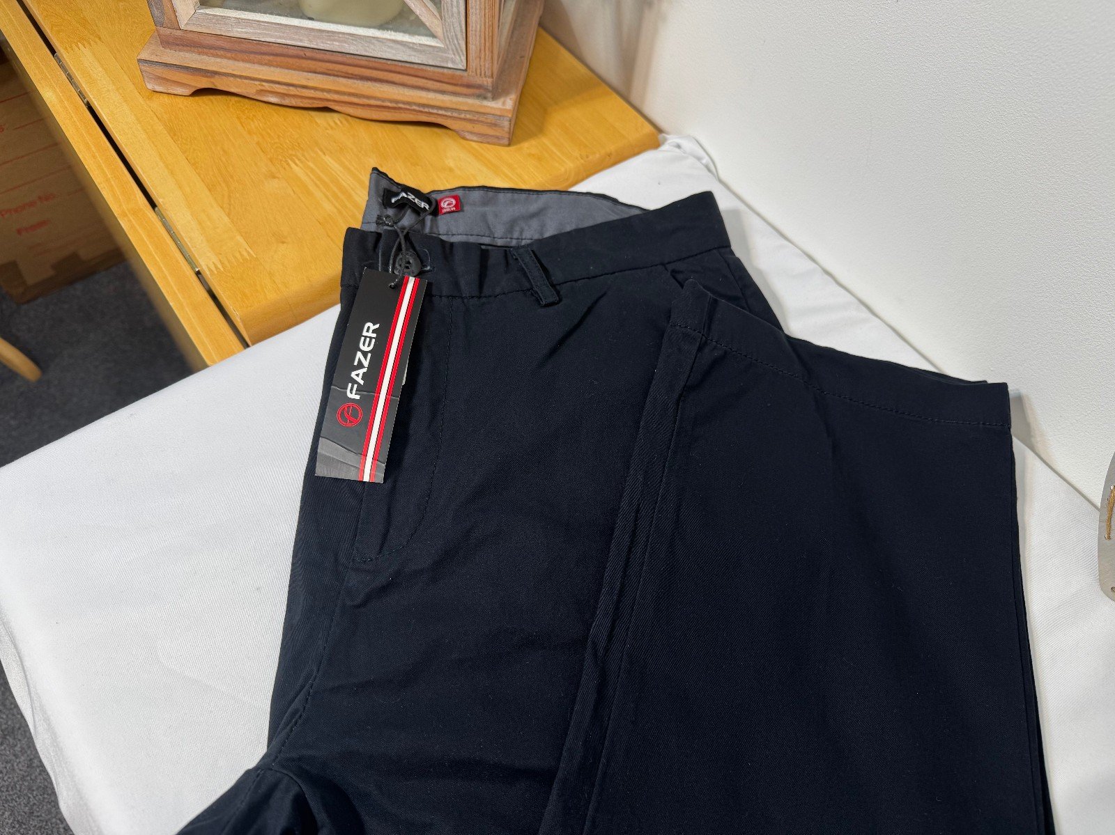 The Fazer Black Chinos W32 L31 are stylish and versatile trousers for men, crafted from cotton material with a flat front design. Featuring a classic black colour and accentuated by the brand logo, these chinos are machine washable and perfect for everyday wear. With a size 32 waist and 31-inch inside leg, these trousers offer a comfortable fit and a timeless chino style. The slash pockets add a practical touch to this wardrobe essential.