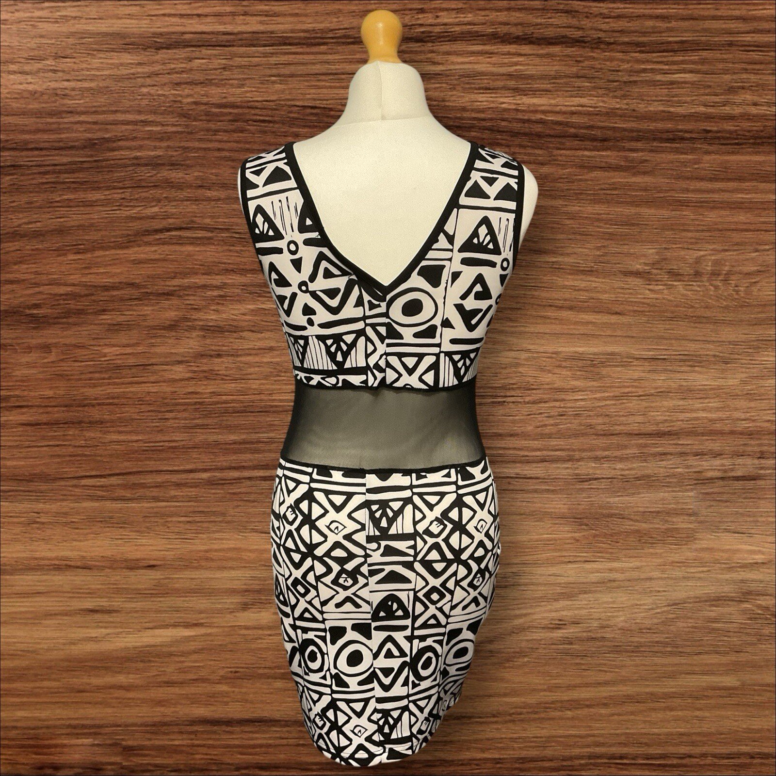 This stylish knee-length dress by Amisu features a striking geometric pattern in black and white. It is made from a blend of polyester and elastane, ensuring a comfortable, flattering fit for women of all sizes. The dress has a sleeveless design, perfect for warmer weather, and is available in a regular size S. The bodycon style is sure to turn heads, and the dress is versatile enough to be worn on any occasion. The dress has a netted yolk and mid back. Excellent condition From a smoke and pet free home