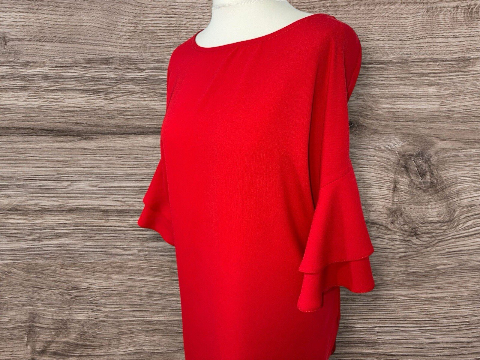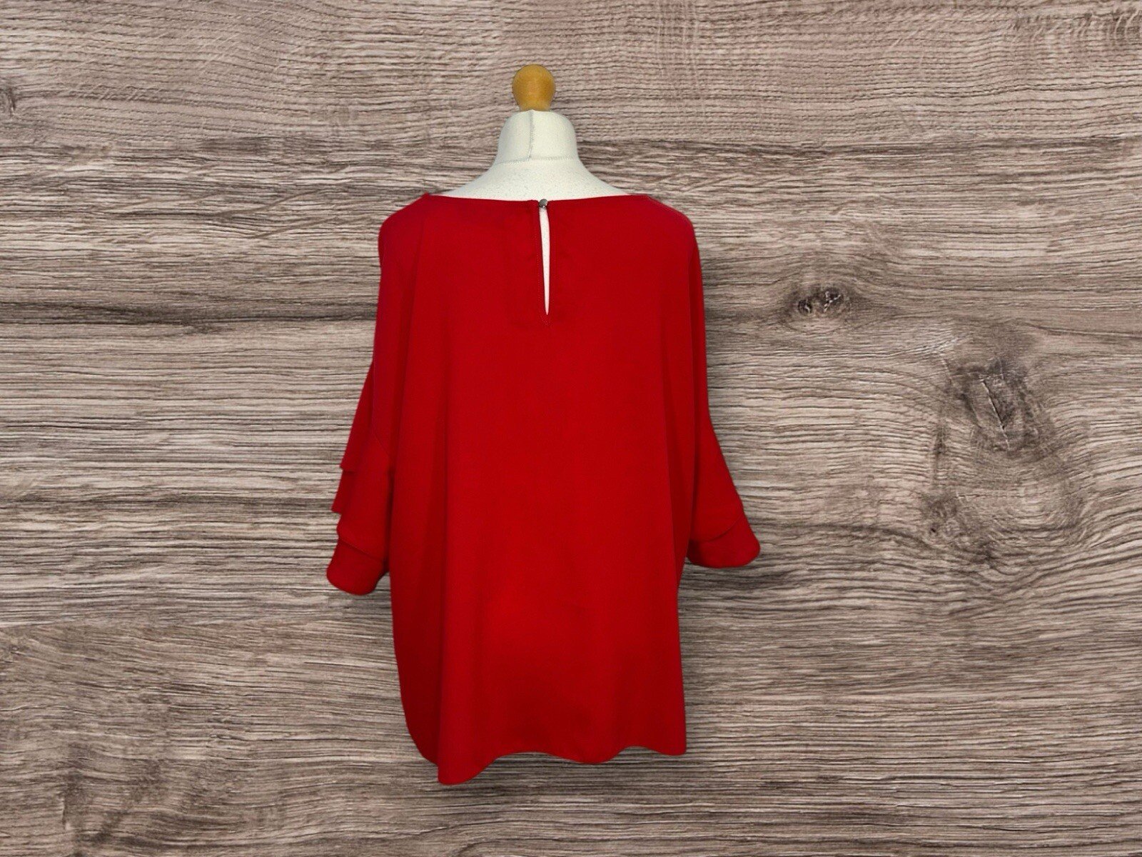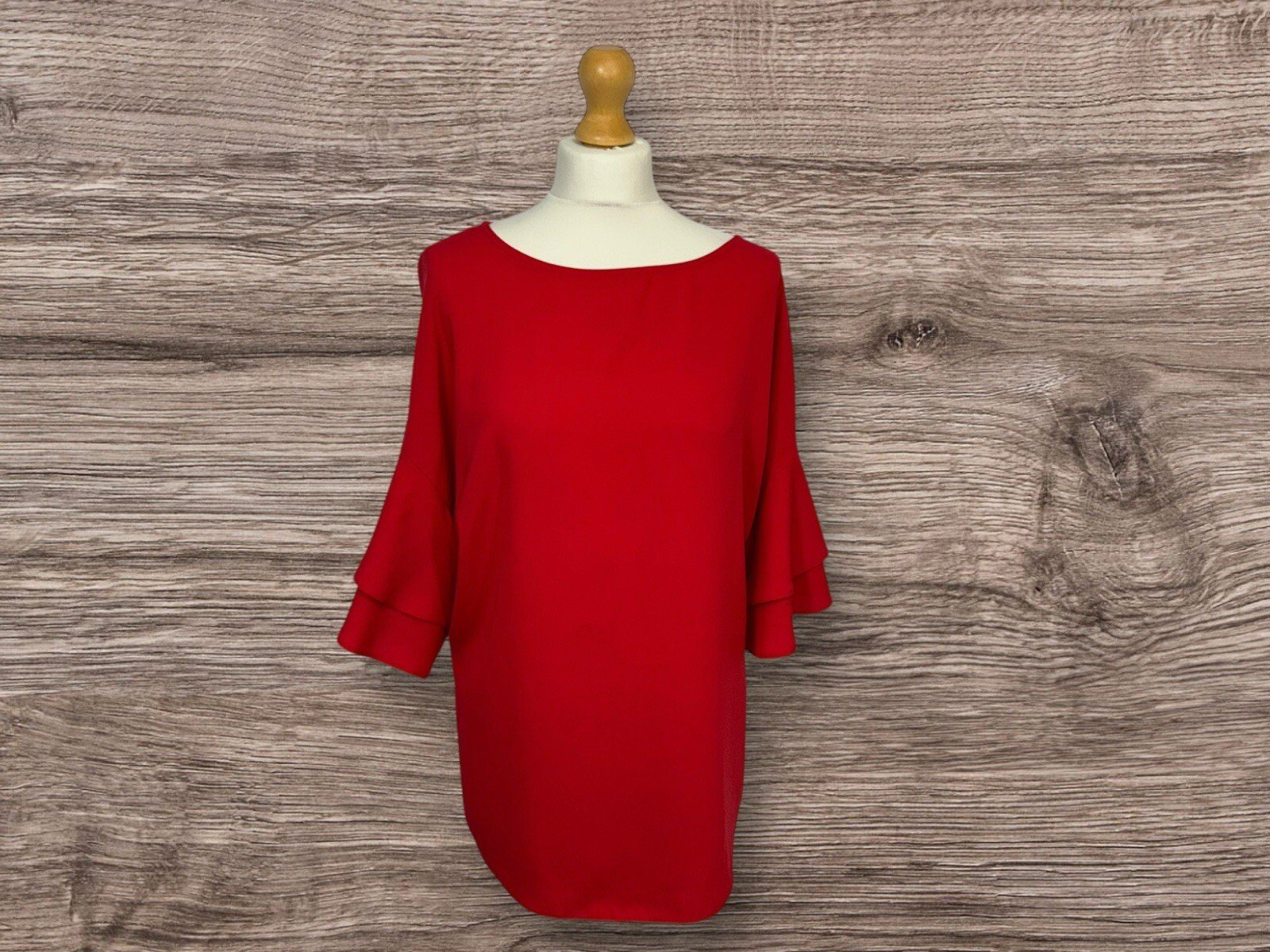 This beautiful F&F blouse in a vibrant shade of red is perfect for any occasion. The boat neck and double bell sleeves add a touch of elegance, while the side splits provide a stylish and comfortable fit. The blouse is made from high-quality polyester material that is both durable and breathable. The relaxed fit and 3/4 sleeves make this blouse perfect for any woman, whether she is dressing up for a night out or keeping it casual during the day. The blouse features a button closure and is available in size 18. Add this stunning F&F blouse to your wardrobe today and elevate your style to the next level. Pit-pit 26in. Length 28in Excellent condition Whilst every care is taken to ensure the garments are checked to a high standard and most are in As New Condition. However they are used garments and therefore may show some small signs of wear.