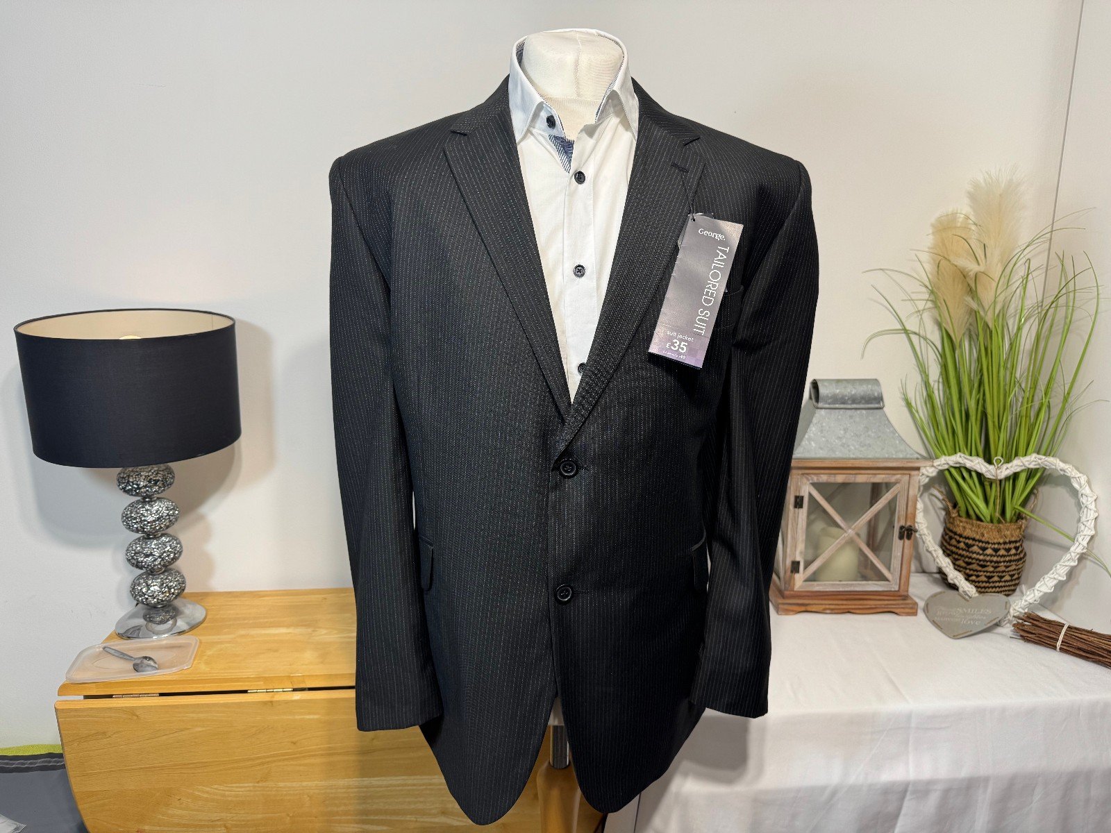 PIT-PIT 26IN. LENGTH 31INThe George Black Pinstripe Tailored Fit Jacket in size 48R is a stylish and sophisticated choice for men looking for a tailored suit jacket. This single-breasted jacket features a classic notch lapel, four-button sleeve detail, and a flat front design. The black pinstripe pattern adds a touch of elegance, while the double-vented back ensures a comfortable and flattering fit. Made from high-quality polyester lining, this jacket is perfect for formal events or professional settings. The George brand ensures quality and style that will make a statement in any wardrobe.ref5