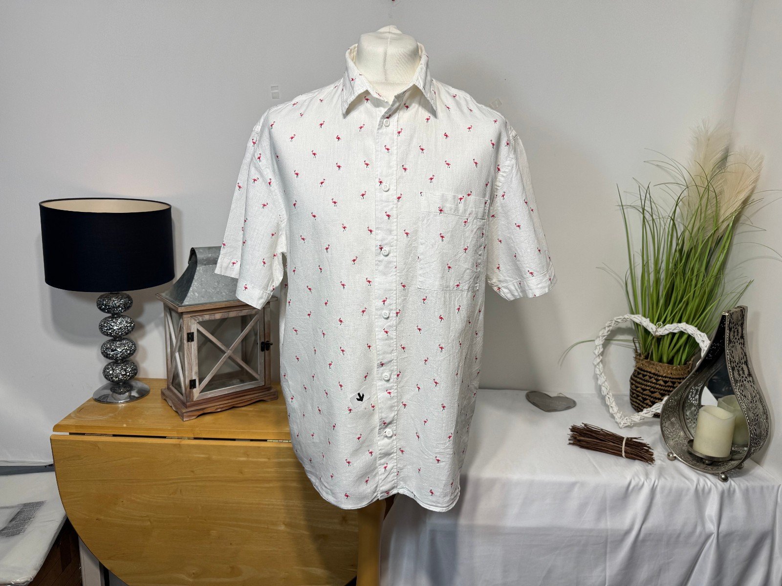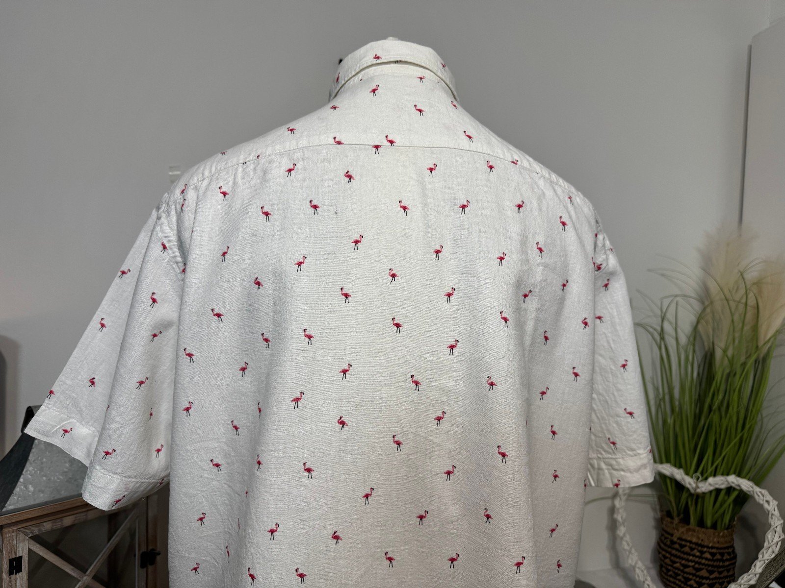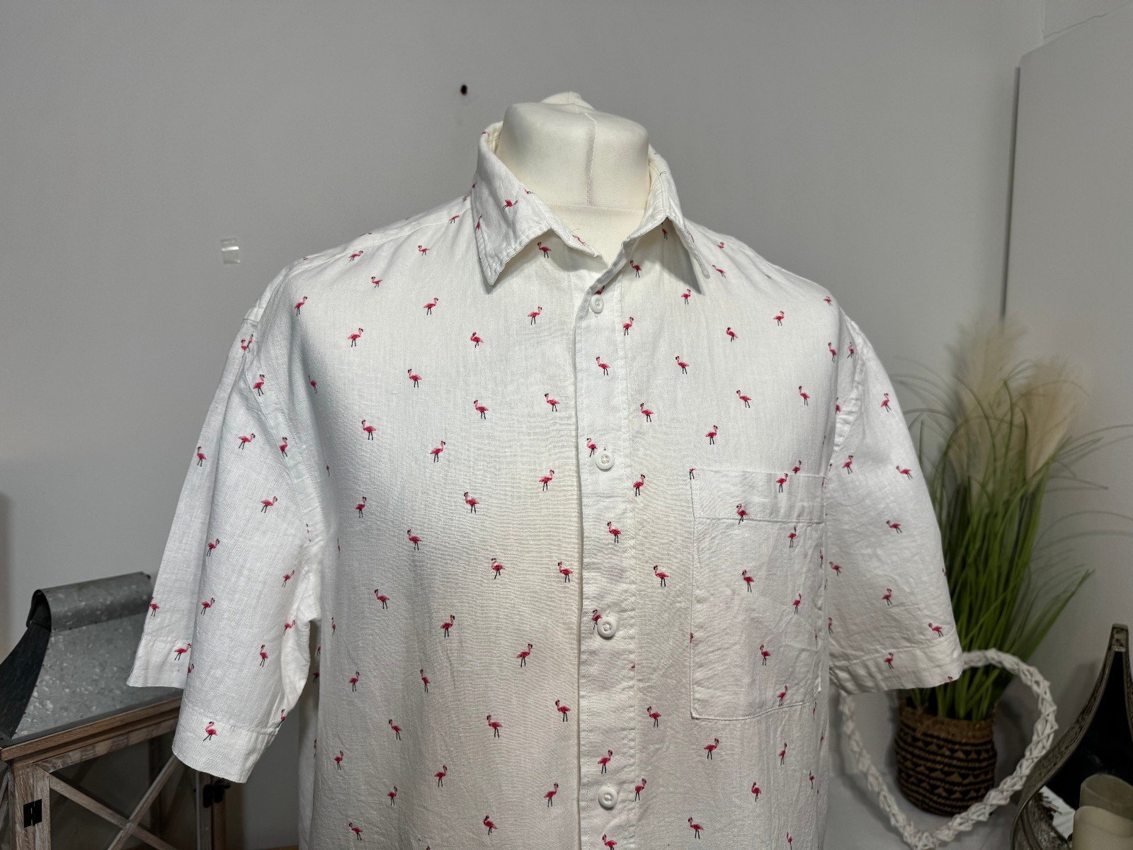 PIT-PIT25IN. LENGTH 29INThe H&M White Flamingo Print Linen Blend Shirt in size XL is a stylish and casual addition to any man’s wardrobe. Made from a comfortable linen-cotton blend, this short-sleeved shirt features a collared neckline and button closure. The white colour and flamingo print add a fun and unique touch, making it perfect for casual occasions. Easy to care for with machine washable fabric, this regular fit shirt from a trusted brand like H&M is a versatile and trendy choice for everyday wear.R10