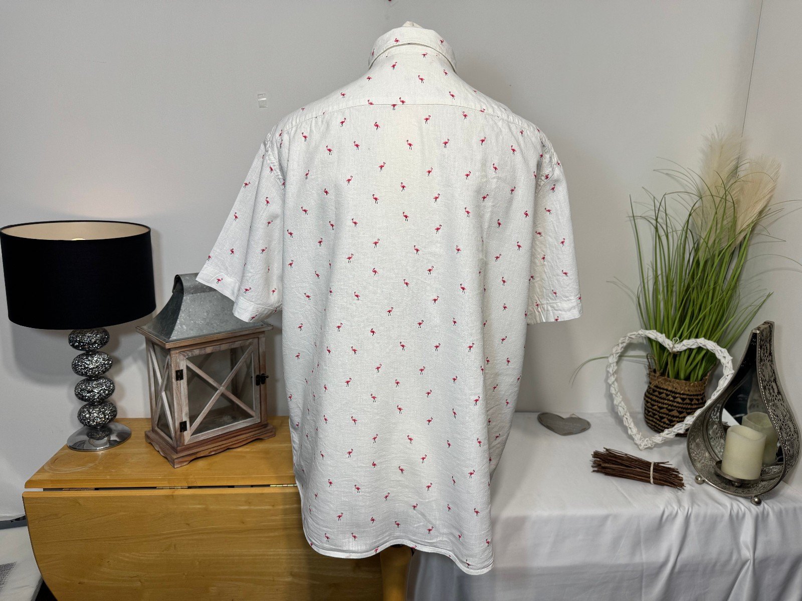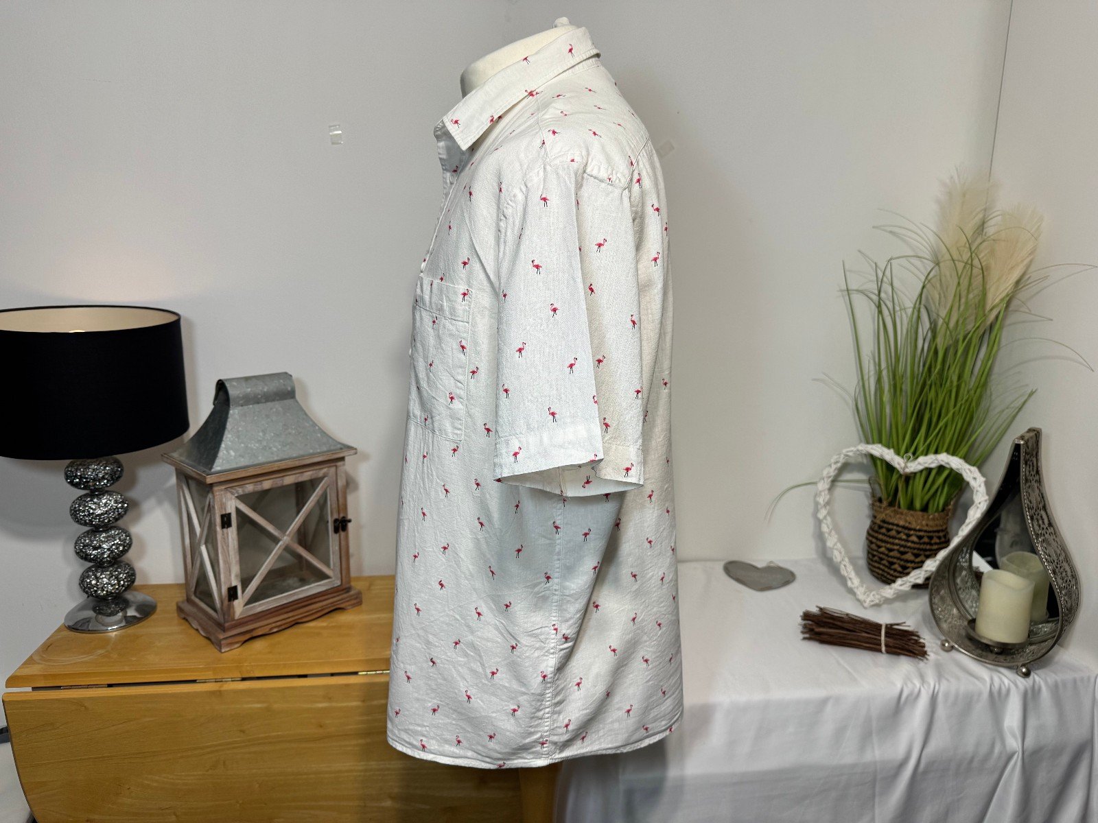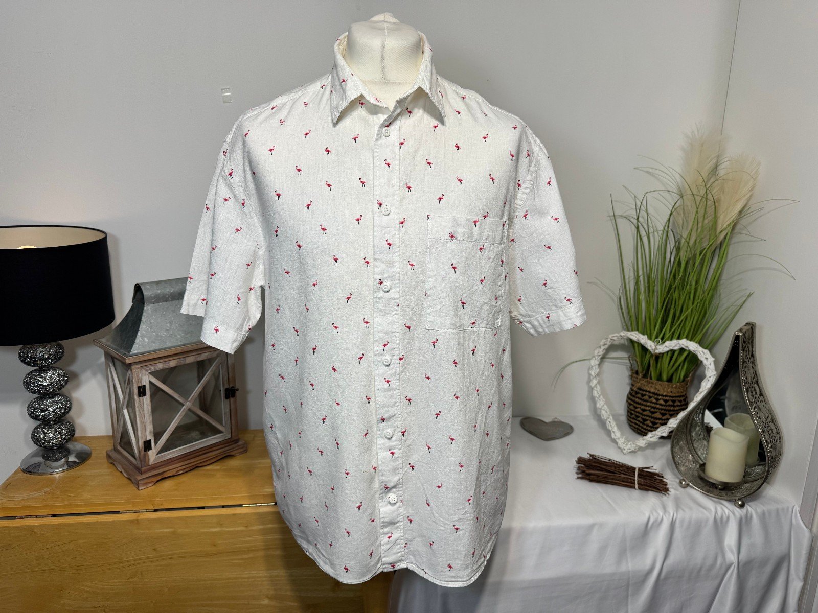 PIT-PIT25IN. LENGTH 29INThe H&M White Flamingo Print Linen Blend Shirt in size XL is a stylish and casual addition to any man’s wardrobe. Made from a comfortable linen-cotton blend, this short-sleeved shirt features a collared neckline and button closure. The white colour and flamingo print add a fun and unique touch, making it perfect for casual occasions. Easy to care for with machine washable fabric, this regular fit shirt from a trusted brand like H&M is a versatile and trendy choice for everyday wear.R10