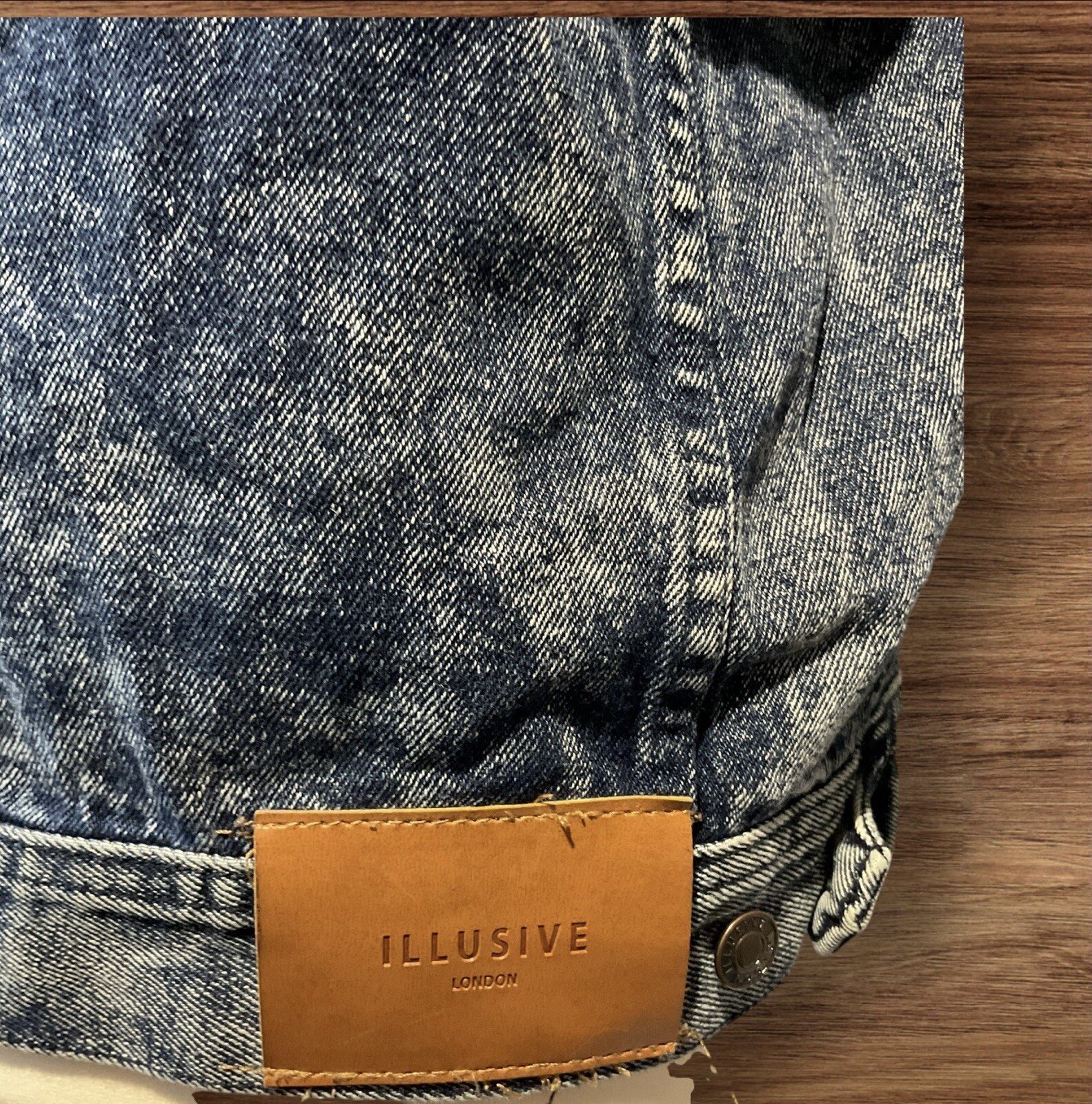 Add a touch of edgy style to your wardrobe with this Illusive London denim jacket. The dark blue colour and distressed denim make it perfect for a night out in London or a casual day at work. Made from cotton, this short-length jacket is designed for unisex adults and comes in size S. The jacket features a rippled design, adding to its unique style. The London theme is perfect for those who love the city and its iconic landmarks. This denim jacket is perfect for any occasion and can be paired with a variety of outfits. Get your hands on this stylish jacket today! Pit to pit 24in Excellent condition From a smoke and pet free home