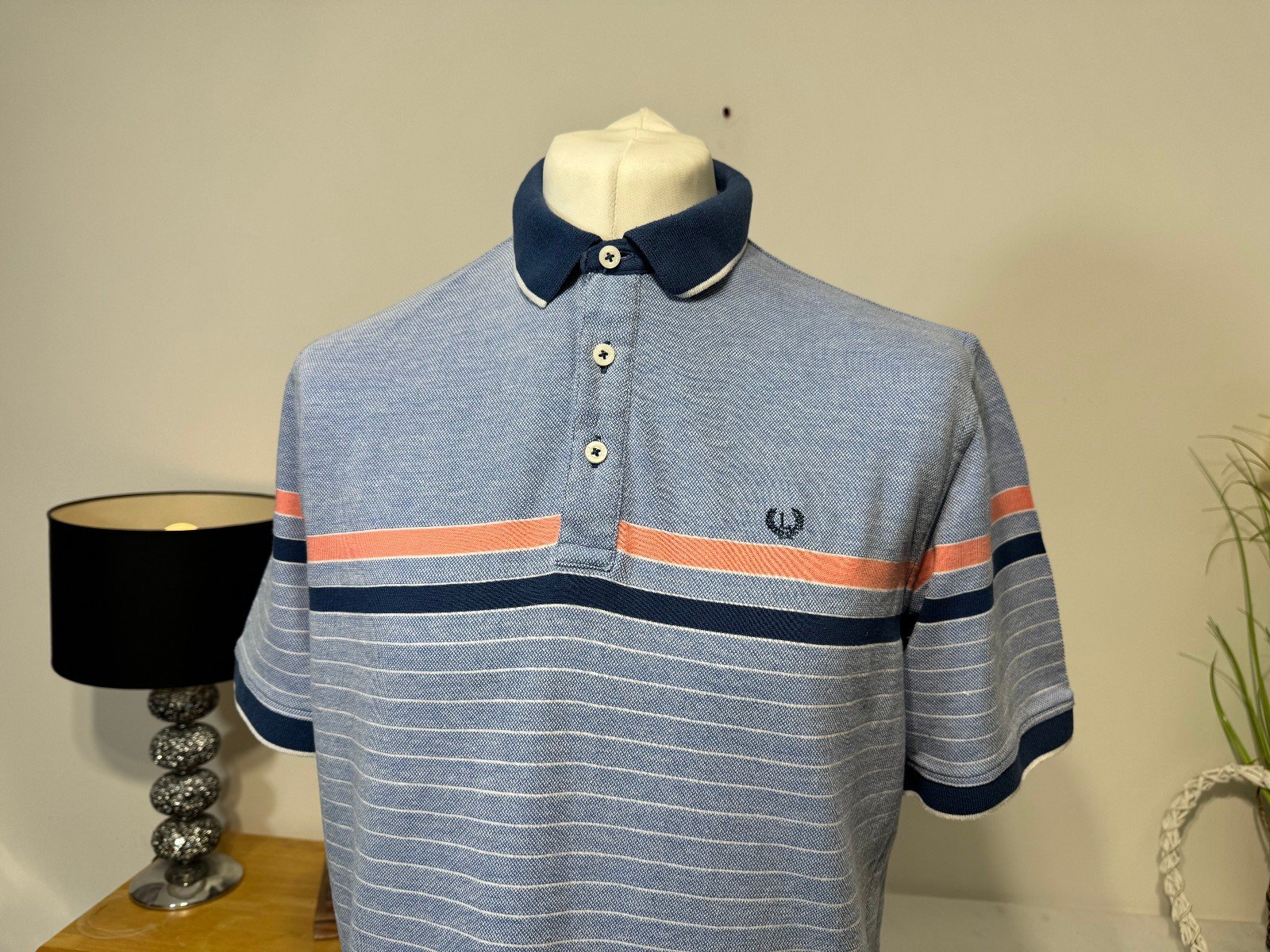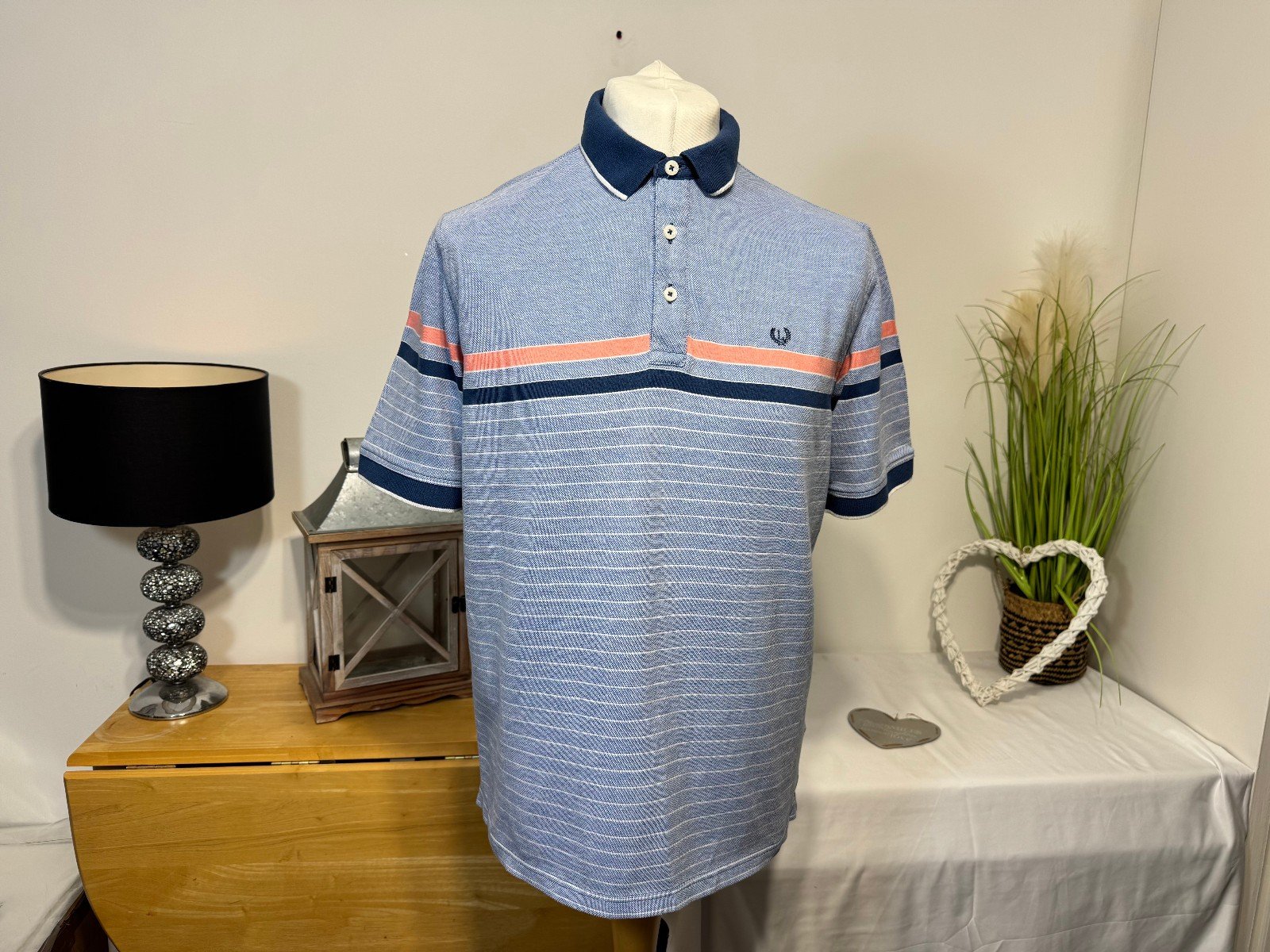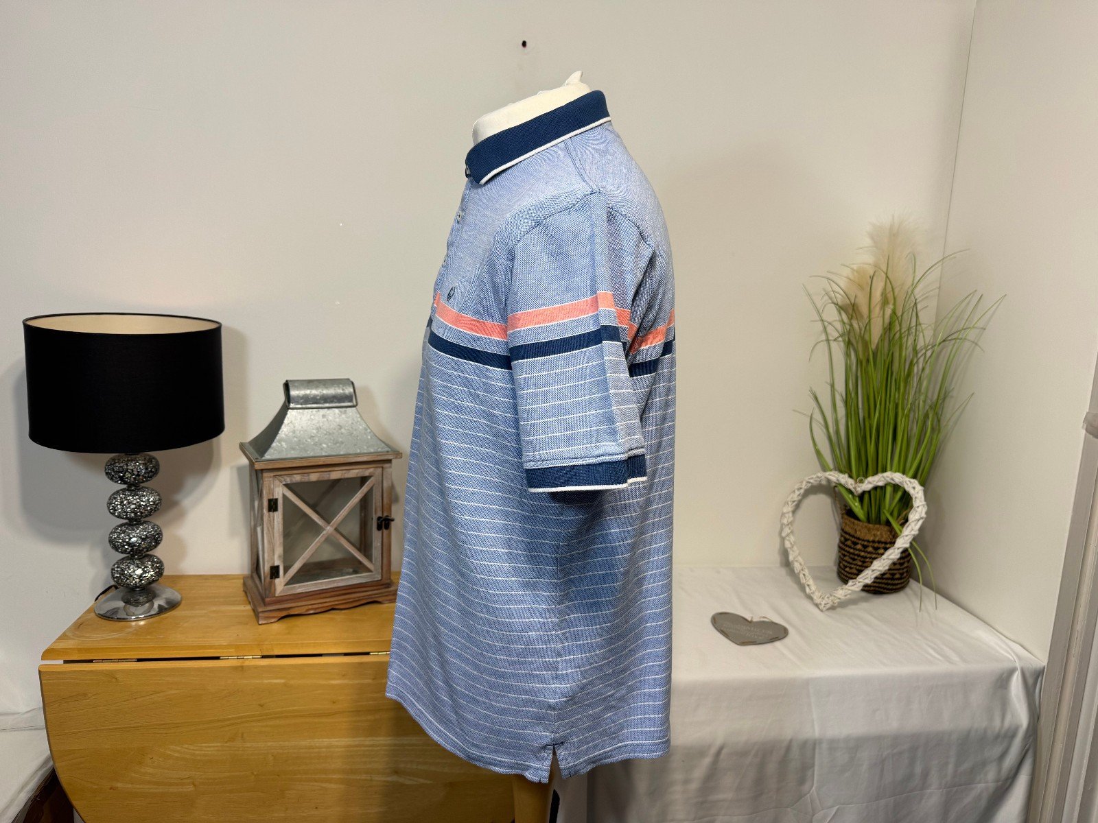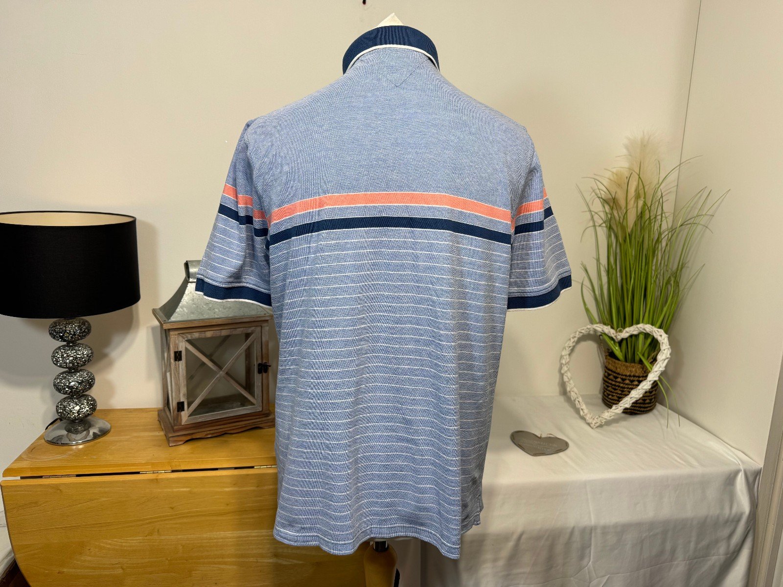 PIT-PIT 23″.  LENGTH 28″The Lincoln Pique Knit Polo Shirt in size L is a stylish and comfortable addition to any man’s wardrobe. Made from a blend of polyester and cotton, this short-sleeved shirt features a collared neckline and button closure, perfect for casual occasions. The blue striped design with a logo accent adds a touch of sophistication to this regular fit polo shirt from the trusted brand, Lincoln. Easy to care for with machine washable material, this polo shirt is a versatile and practical choice for everyday wear.R10