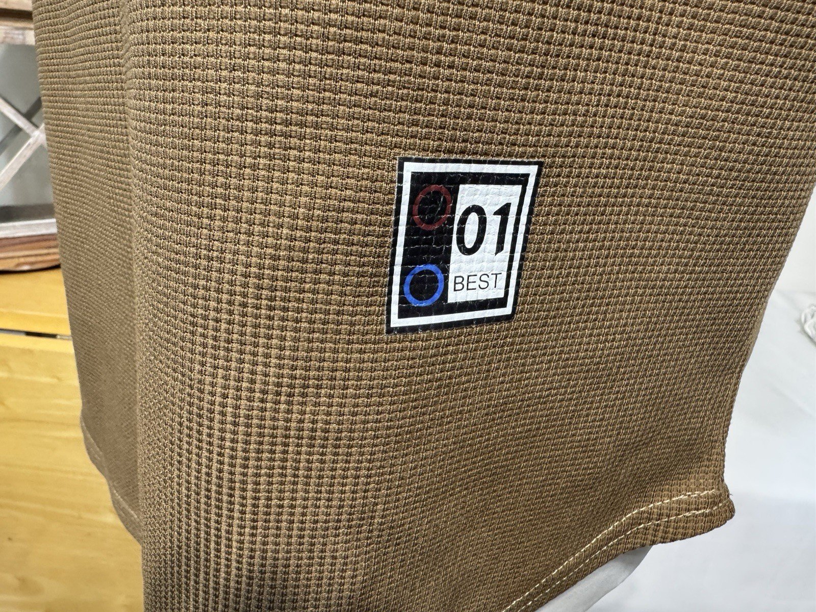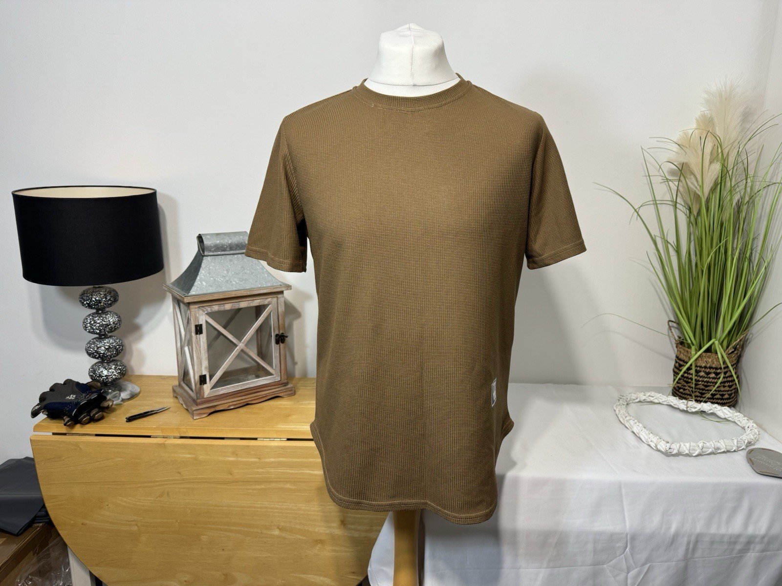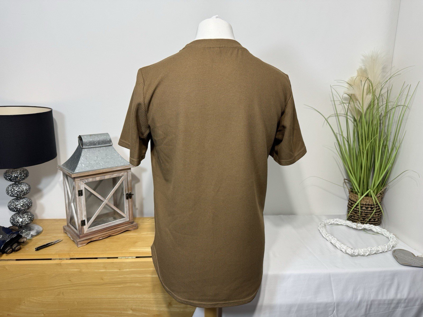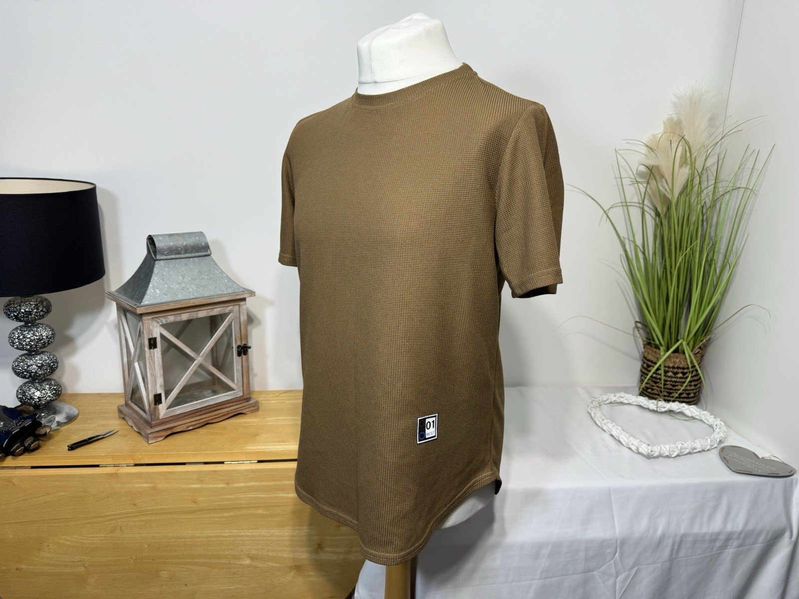 PIT -PIT 21”. LENGTH 27”The Manfinity Taupe Waffle Design Short Sleeve T-Shirt in size M is a stylish and versatile garment perfect for men. Made from polyester, this beige-coloured shirt features a waffle pattern, round neckline, and a regular fit. Easy to care for with its machine washable design, this designer t-shirt is ideal for the summer season. The classic and trendy style of this T-shirt makes it a must-have for any man’s wardrobe, offering a comfortable and fashion-forward option for everyday wear.