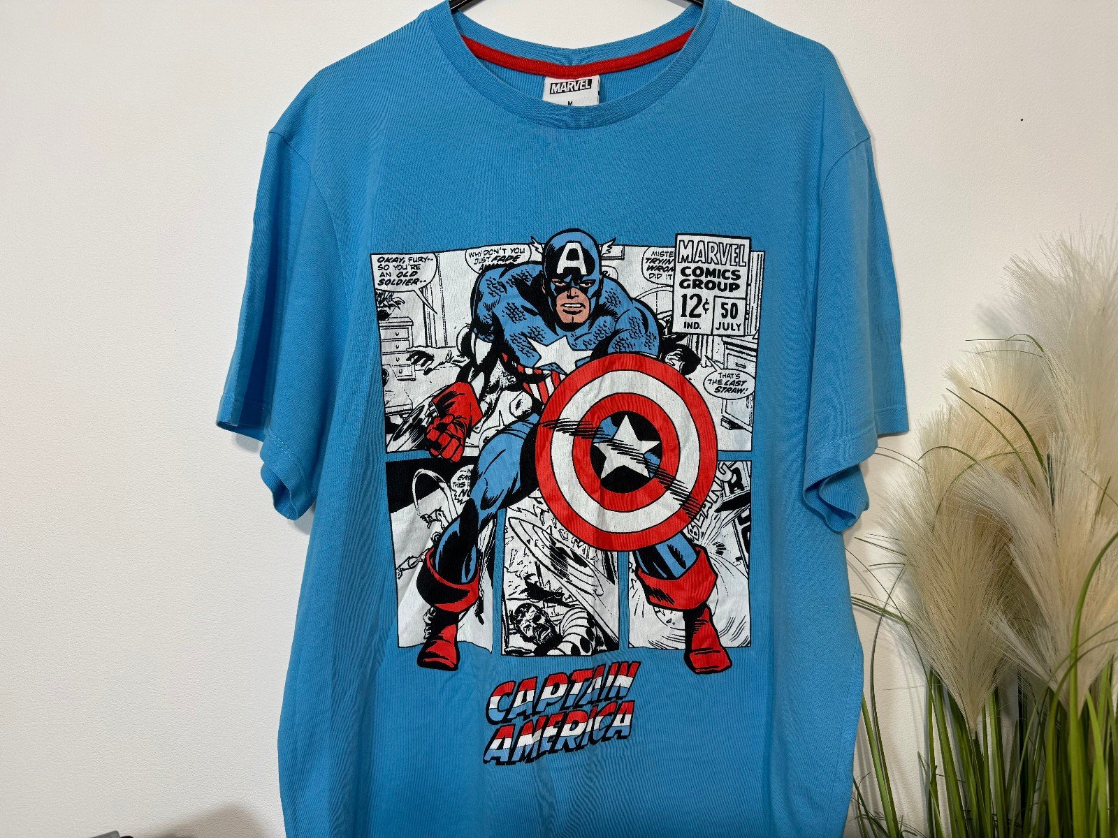 PIT-PIT 21IN. LENGTH 26INThis Marvel Captain America T-Shirt in size M features a graphic print of the iconic character, Captain America. Made from comfortable cotton jersey fabric, this short sleeve t-shirt is machine washable and perfect for fans of the superhero. The regular fit and blue colour make it a versatile piece for men who love the Captain America comics and want to show off their fandom in style.