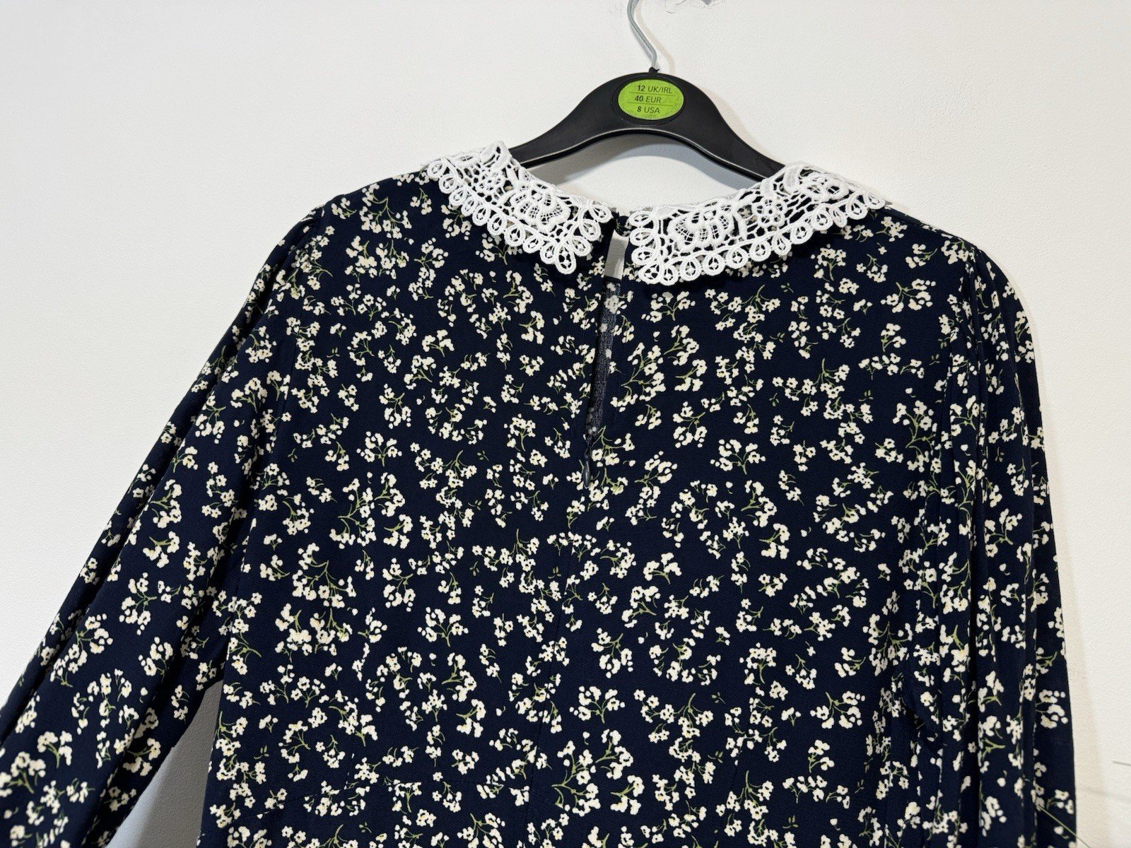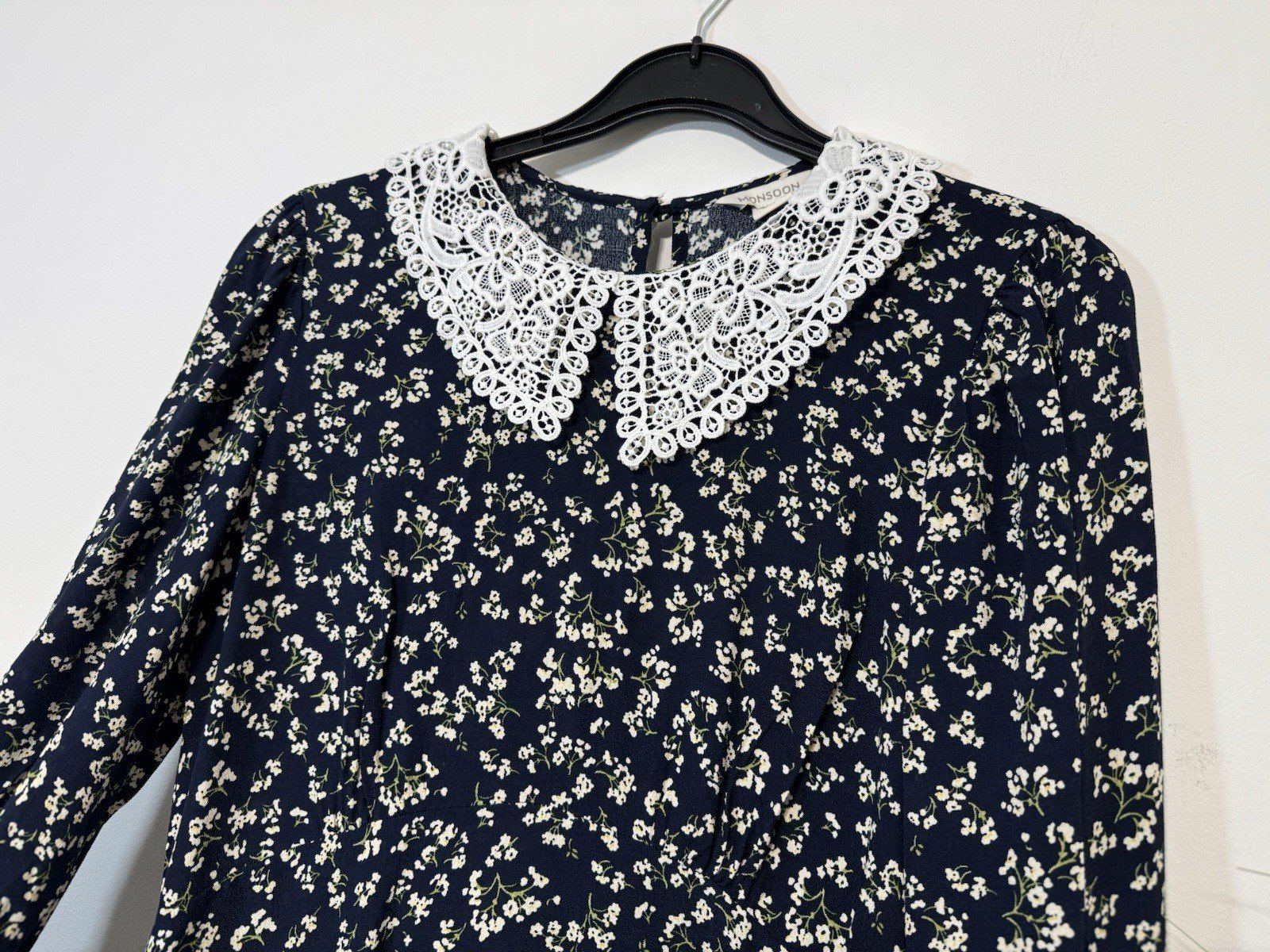 Monsoon Navy Ditsy Floral Dress Lace Yolk Sheer Elasticated Cuff Size 8