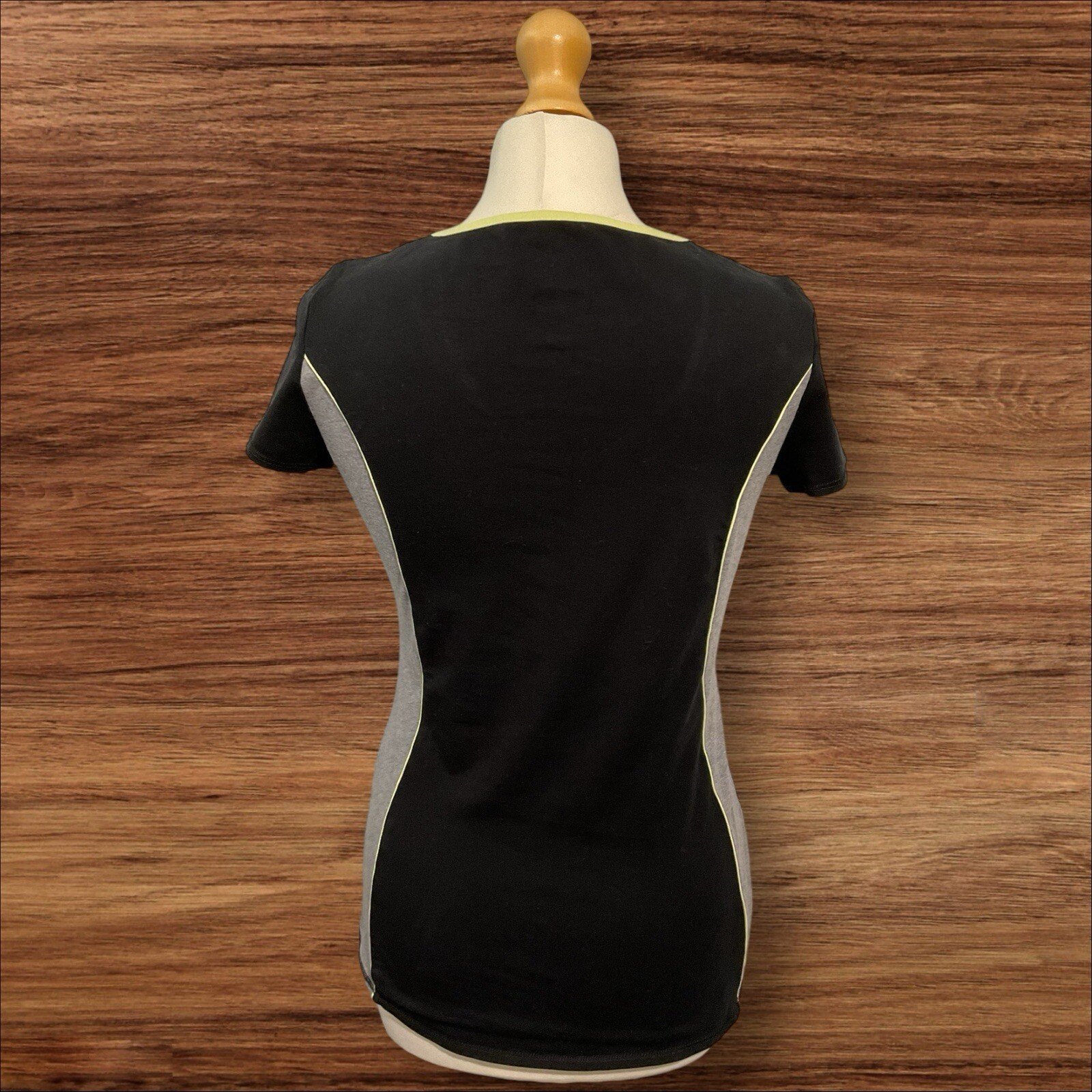 This M&S fitness top is perfect for women who love to stay in shape. The black and grey side panels contrast beautifully with the lime green piping detailing, giving it a stylish and modern look. The V-neckline and short sleeves provide a comfortable fit, making it ideal for any type of physical activity. The top is made by Marks and Spencer, a well-known brand in the clothing industry, and is available in a regular size. The colour of the top is black, and it is perfect for any casual occasion. Whether you're going for a run or just doing some exercise, this top will keep you looking and feeling great. Pit to pit 18in From a smoke and pet free home