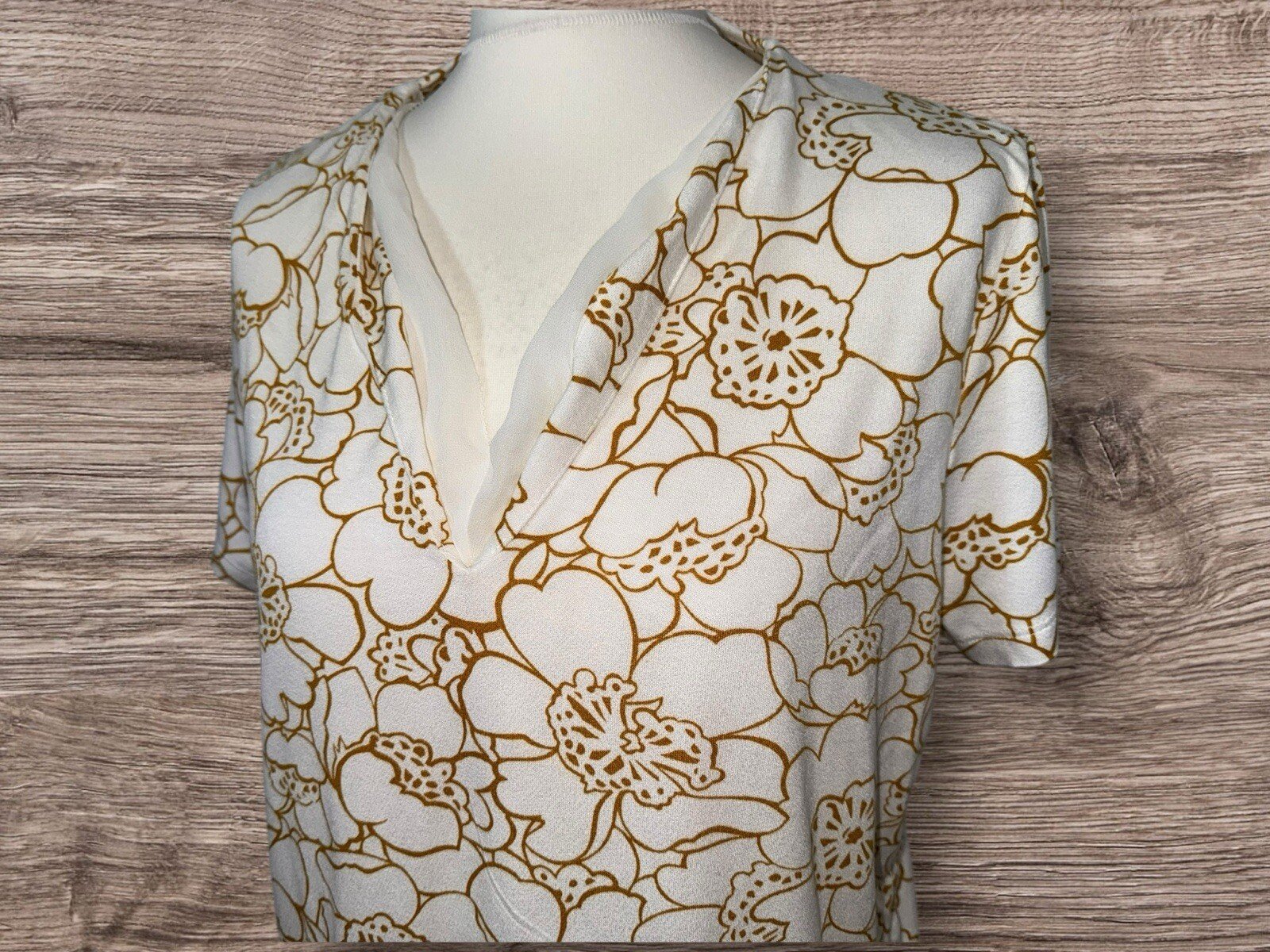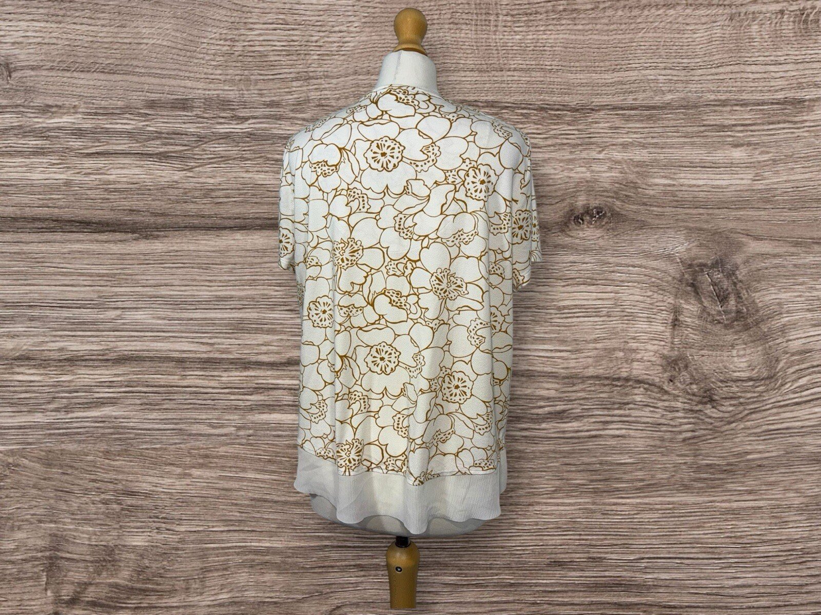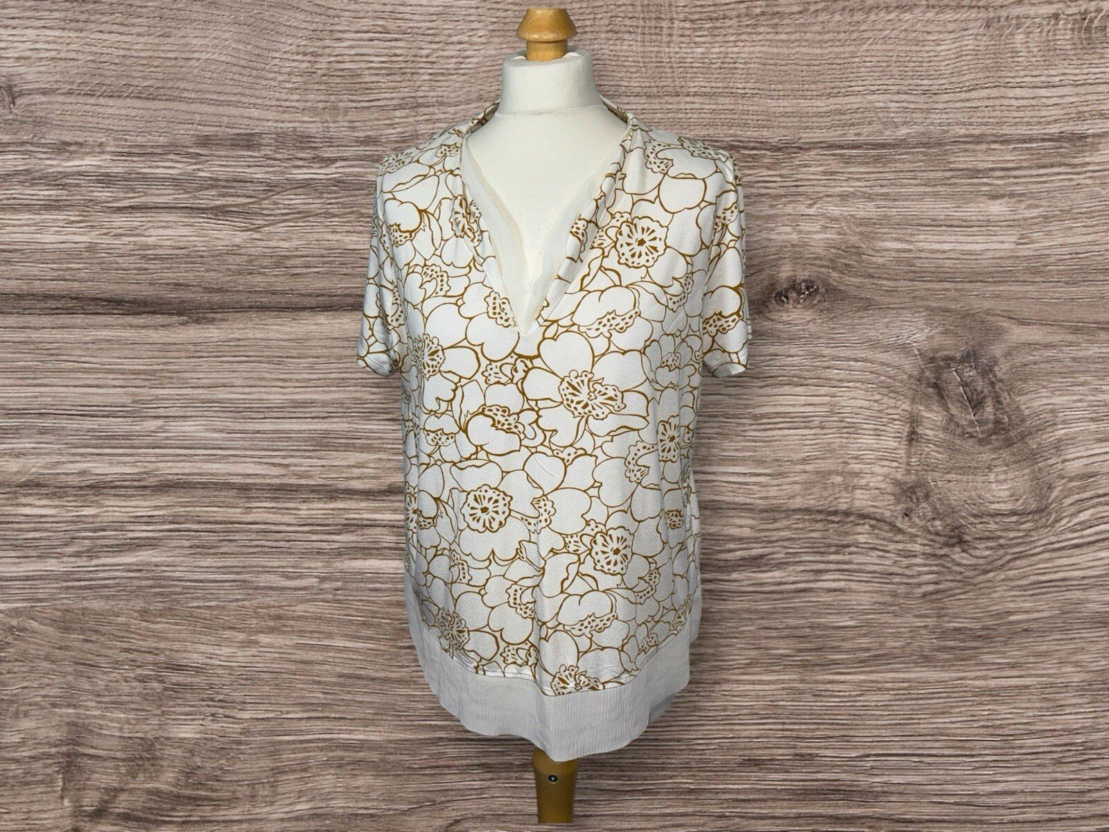This M&S top is perfect for any occasion. The cream coloured blouse is made with a fine fabric that stretches to fit perfectly on a size 16. The V-neckline and short sleeves give it a chic and sophisticated look. The material is made with viscose and elastane, ensuring a comfortable and stretchy fit. The hemline is a great feature of this top, adding a unique touch to the design. The blouse is perfect for pairing with jeans or dress pants, and the stretchy fabric ensures a comfortable and flattering fit. This item is a great addition to any wardrobe, and is sure to become a staple piece for any occasion. Excellent condition