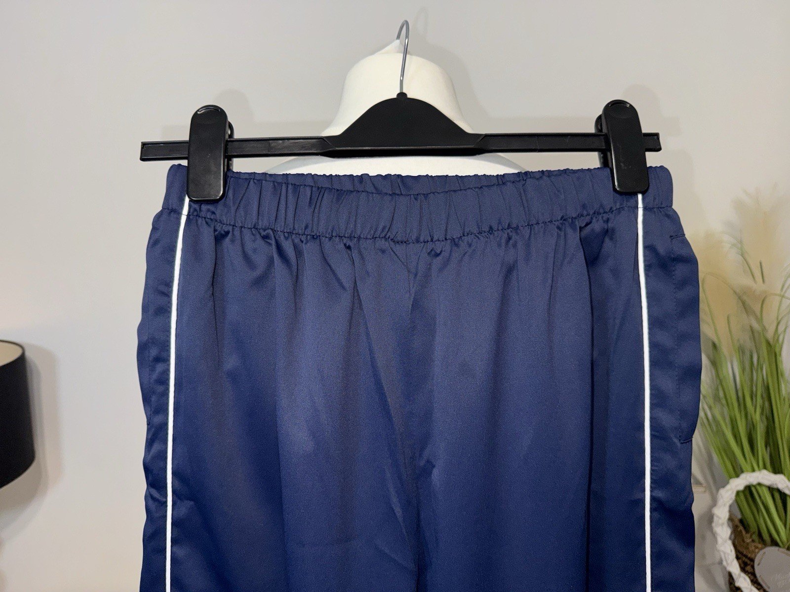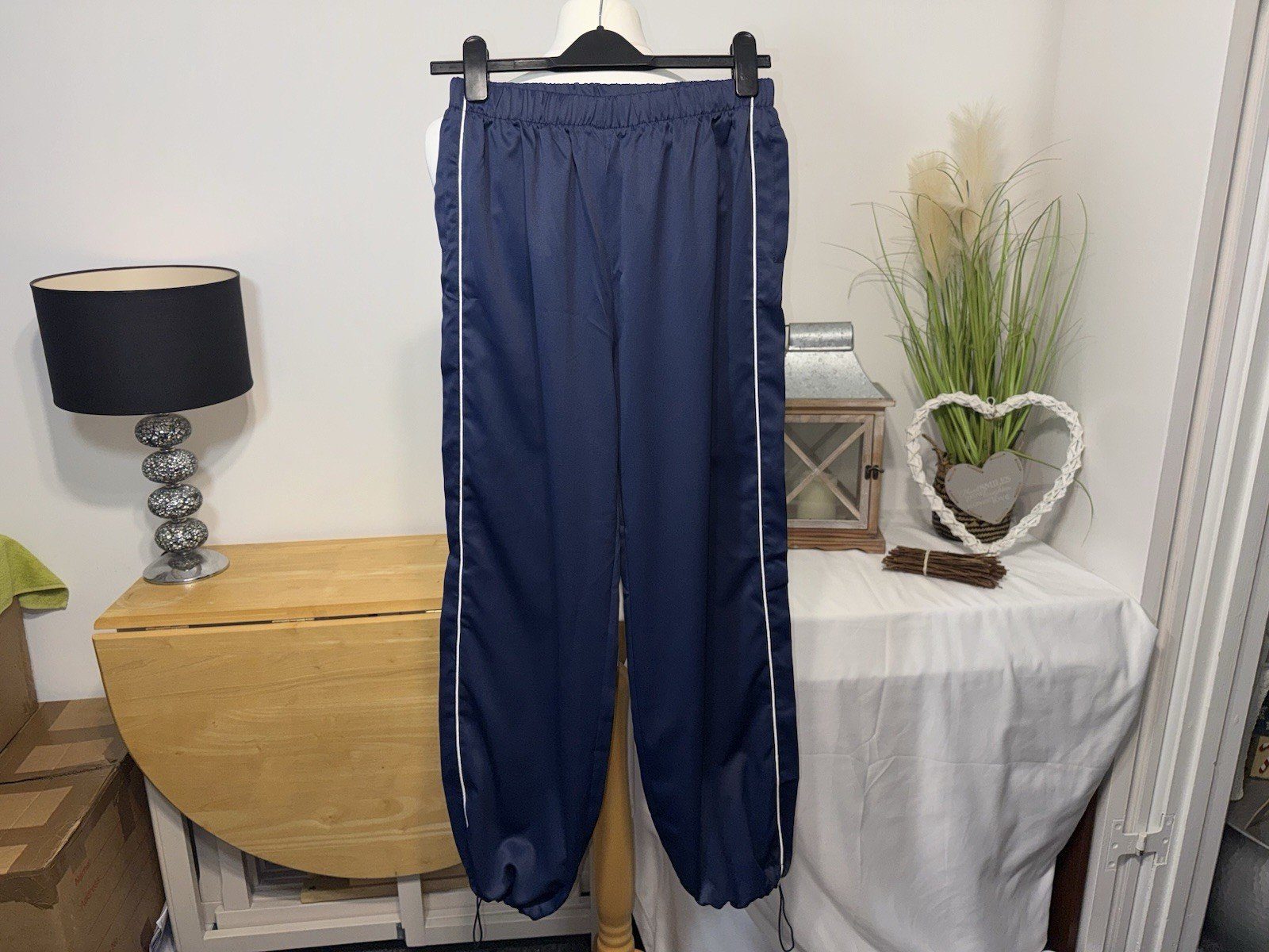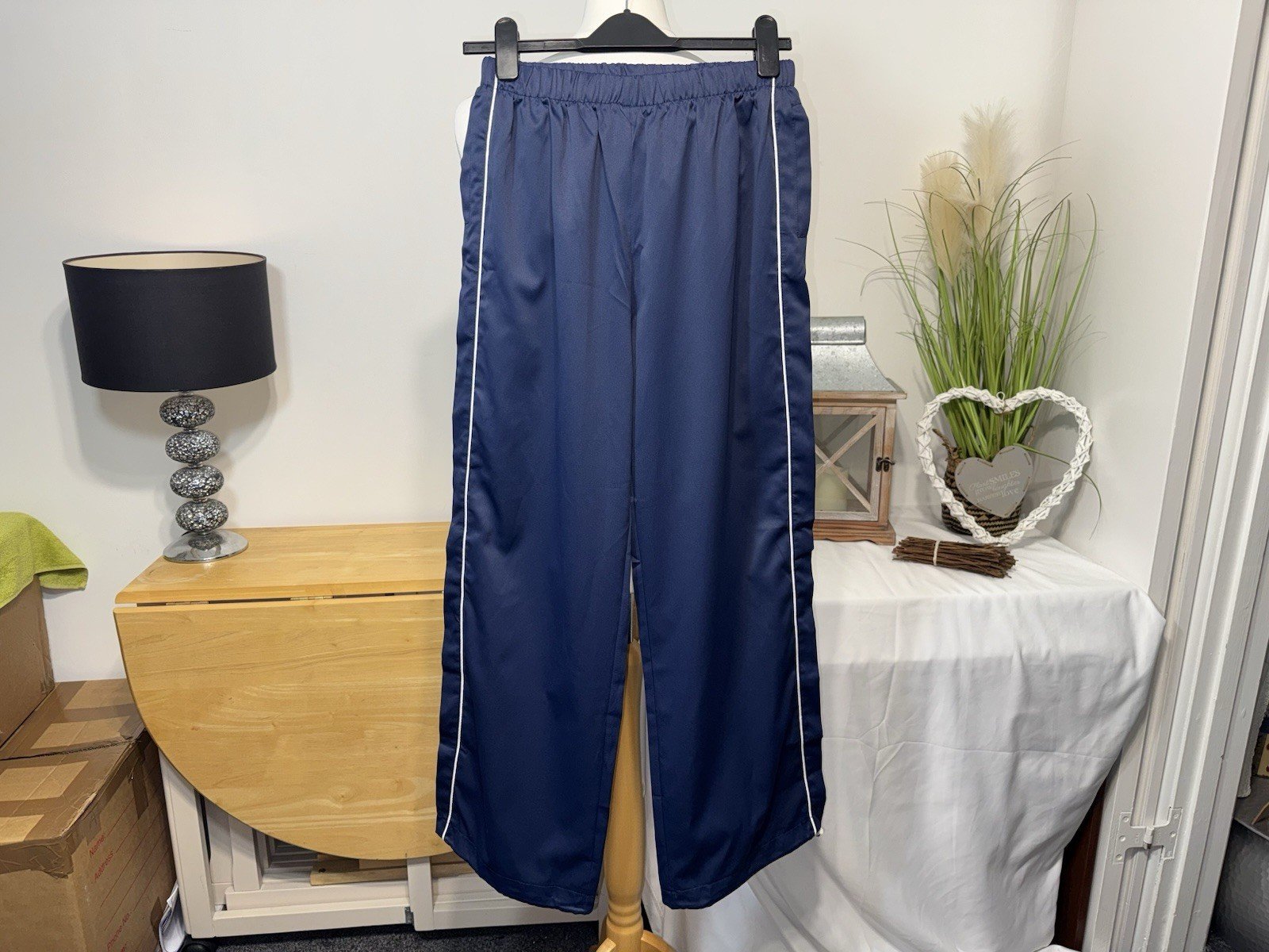 Waist 26in NOT stretched. Leg 30inThese navy blue activewear trousers are designed for a relaxed fit with an elasticated waist and cuff, making them comfortable for everyday wear. The straight leg style and jogger design add a trendy touch to the overall look, while the polyester material ensures durability. Perfect for both men and women in size small, these trousers are a versatile addition to any wardrobe, offering a stylish and practical option for casual or athletic outfits.