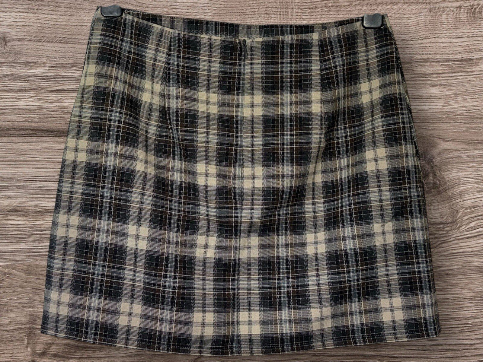BRAND NEW. This Primark check mini skirt is a must-have addition to any fashion-forward woman's wardrobe. The skirt is made of a blend of polyester and elastane, ensuring a comfortable and flattering fit. The brown and black check pattern is a timeless classic, making this skirt perfect for any occasion. The skirt has a short length, making it ideal for pairing with your favourite heels or sandals. The back zip close adds a touch of sophistication to the design, while the size 12 fit is perfect for regular-sized women. Whether you're heading to work or out on a date, this skirt is sure to turn heads.