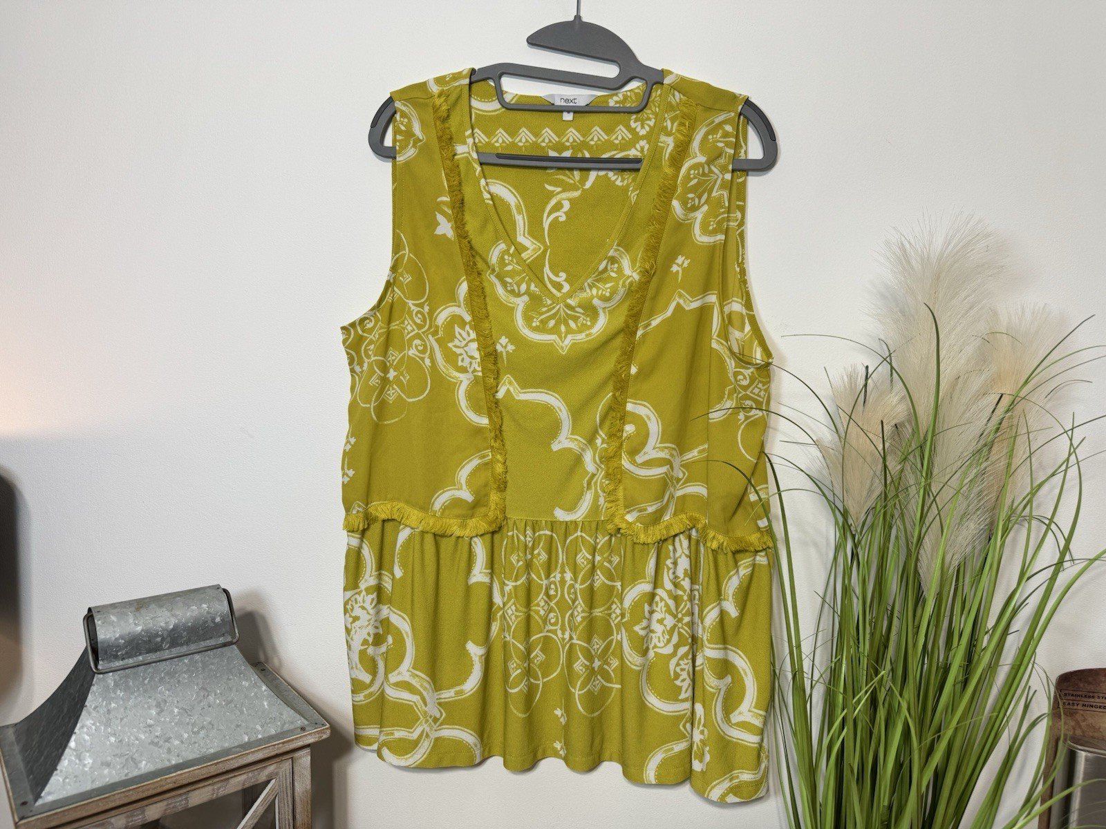 This Next Lime Green Frill Hem Sleeveless Tunic in size 18 is a stylish and versatile addition to any woman’s wardrobe. The floral pattern and V-neckline give it a feminine touch, perfect for casual occasions during the summer season. The regular fit and machine washable material make it easy to wear and care for, while the trendy tunic style adds a modern flair to the classic blouse.