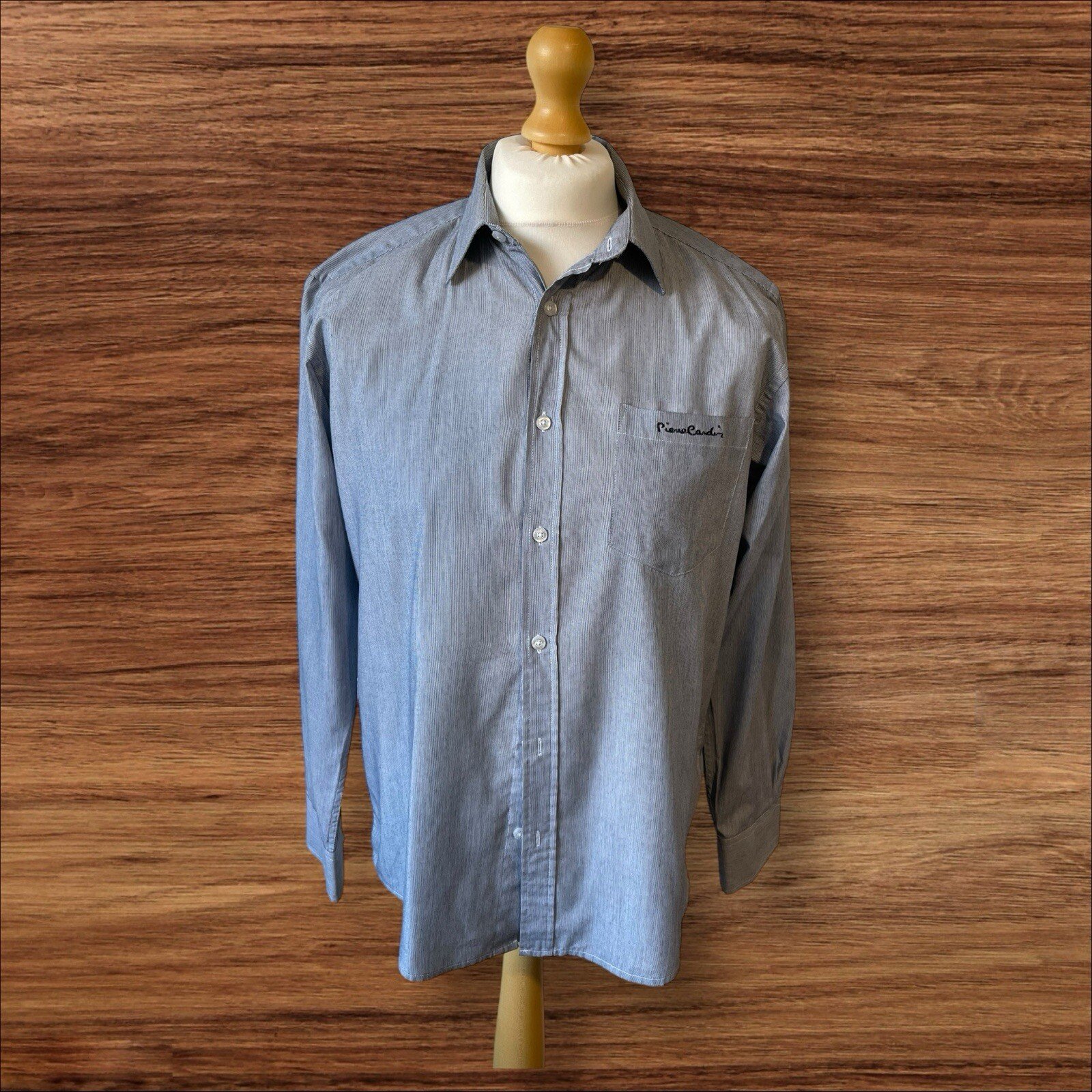 Elevate your style with this elegant Pierre Cardin shirt. The fine pin stripes in blue add a touch of sophistication to this regular fit shirt. The long sleeves and collared neckline make it perfect for any occasion, whether it's a casual day out or a formal event. Crafted with quality materials, this button-up shirt is comfortable to wear and easy to care for. The size M shirt is designed for men and has a regular fit. Ideal for those who want to look sharp and feel comfortable, this shirt is a must-have for any wardrobe. Pit to pit 22in From a smoke and pet free home