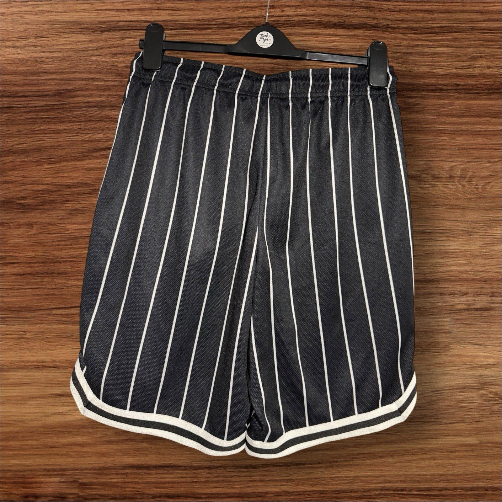 These Primark sweat shorts are perfect for a casual occasion. The black and white striped pattern adds a touch of style to the relaxed fit. The elastic drawstring closure and stretch material ensure a comfortable waist size of 15 inches not stretched. Made of polyester, these shorts are ideal for men or women who want to stay comfortable without sacrificing style. The front badge adds a unique touch to the design. These shorts are perfect for anyone looking for a stylish and comfortable addition to their wardrobe. Excellent condition From a smoke and pet free home Thanx for looking
