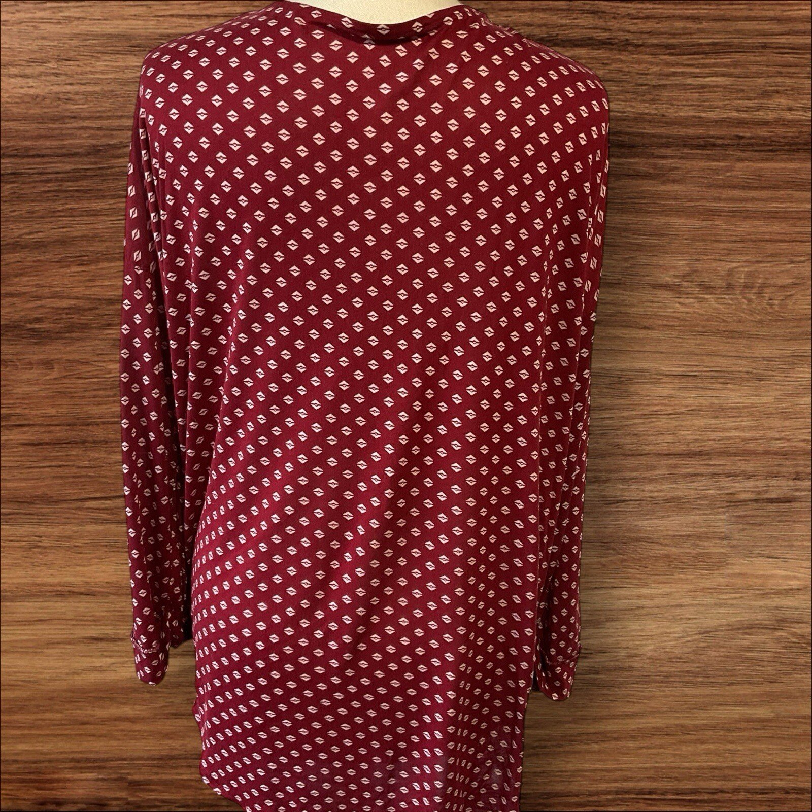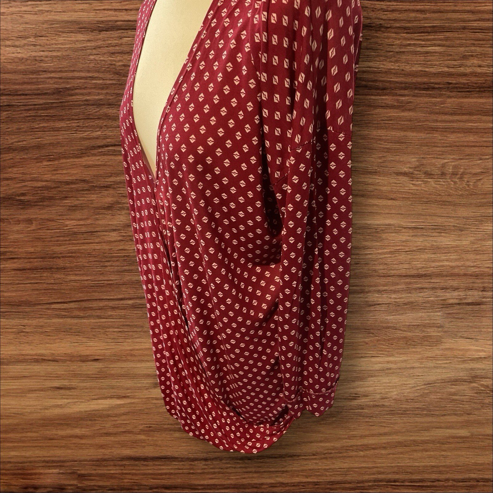 This Primark top in a deep red colour with white diamond pattern is perfect for any occasion. The V-neckline and wrap style add a touch of elegance, while the elastic waist and turn-up cuffs ensure a comfortable fit. The long sleeves make it suitable for colder weather, and the viscose material adds a soft and breathable feel. This blouse is available in size 16 and is ideal for any woman looking for a stylish and comfortable top. Put to pit 25in Good condition Thanx for looking RefLB1