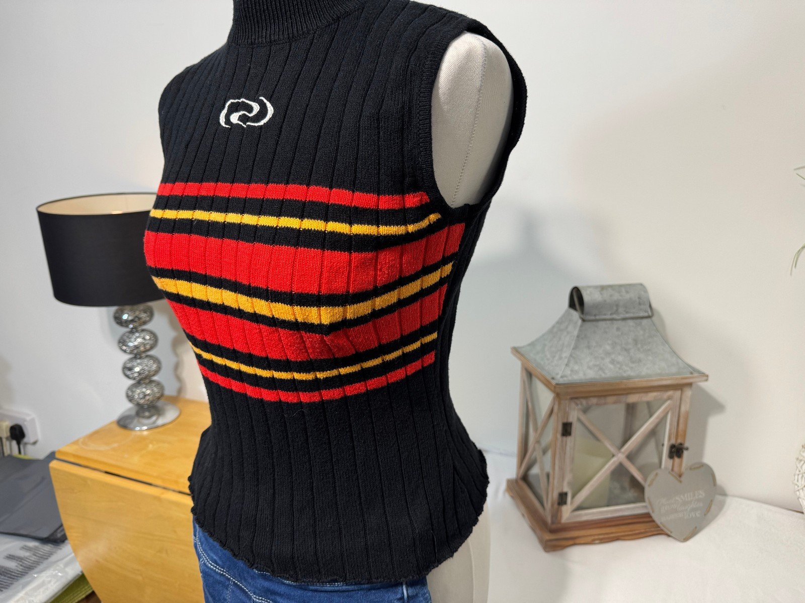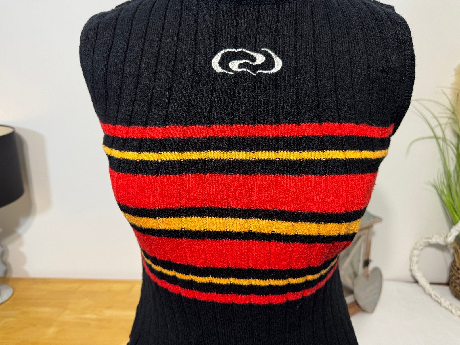 The Resume Black Embossed Logo Ribbed High Neck Tank Top in size S is a stylish and versatile addition to any woman’s wardrobe. This sleeveless top features a high neckline with a pullover closure, making it perfect for casual occasions. Made from a comfortable knit fabric in black, it offers a regular fit and is machine washable for easy care. The embossed logo adds a touch of sophistication to the design, making it a chic choice for everyday wear.