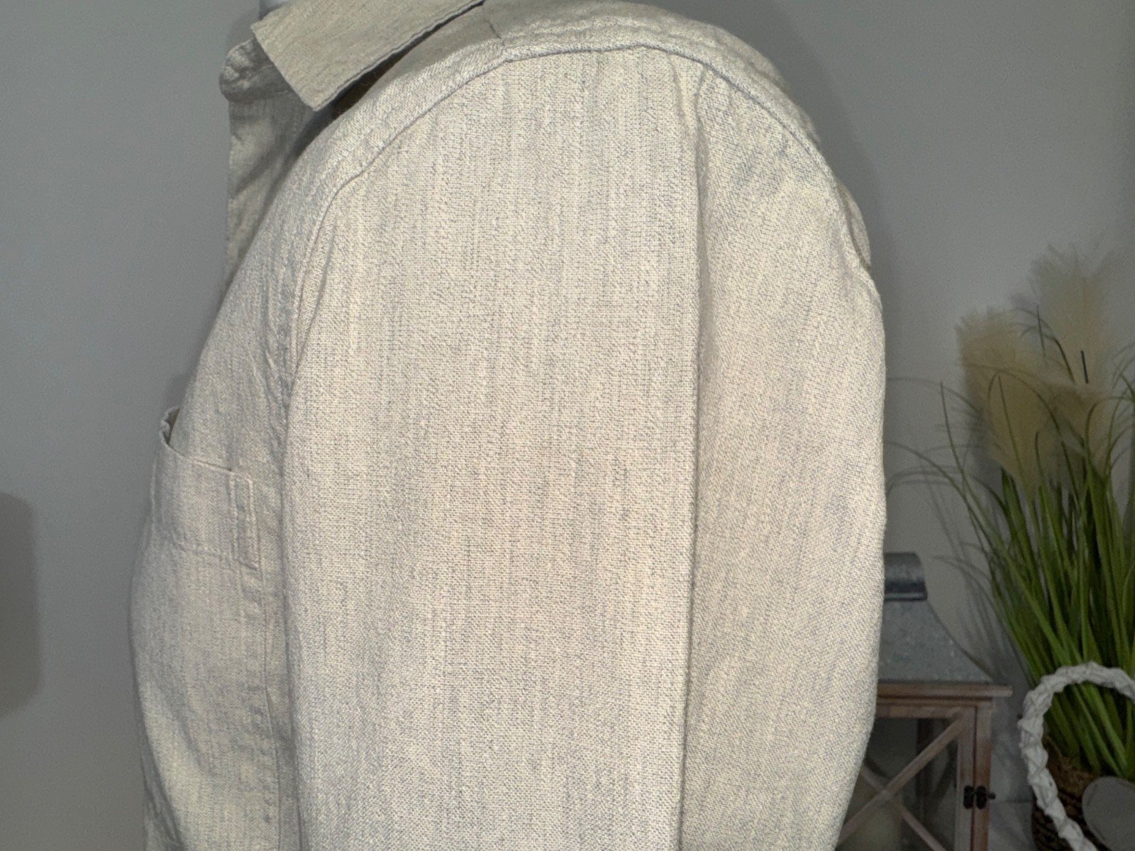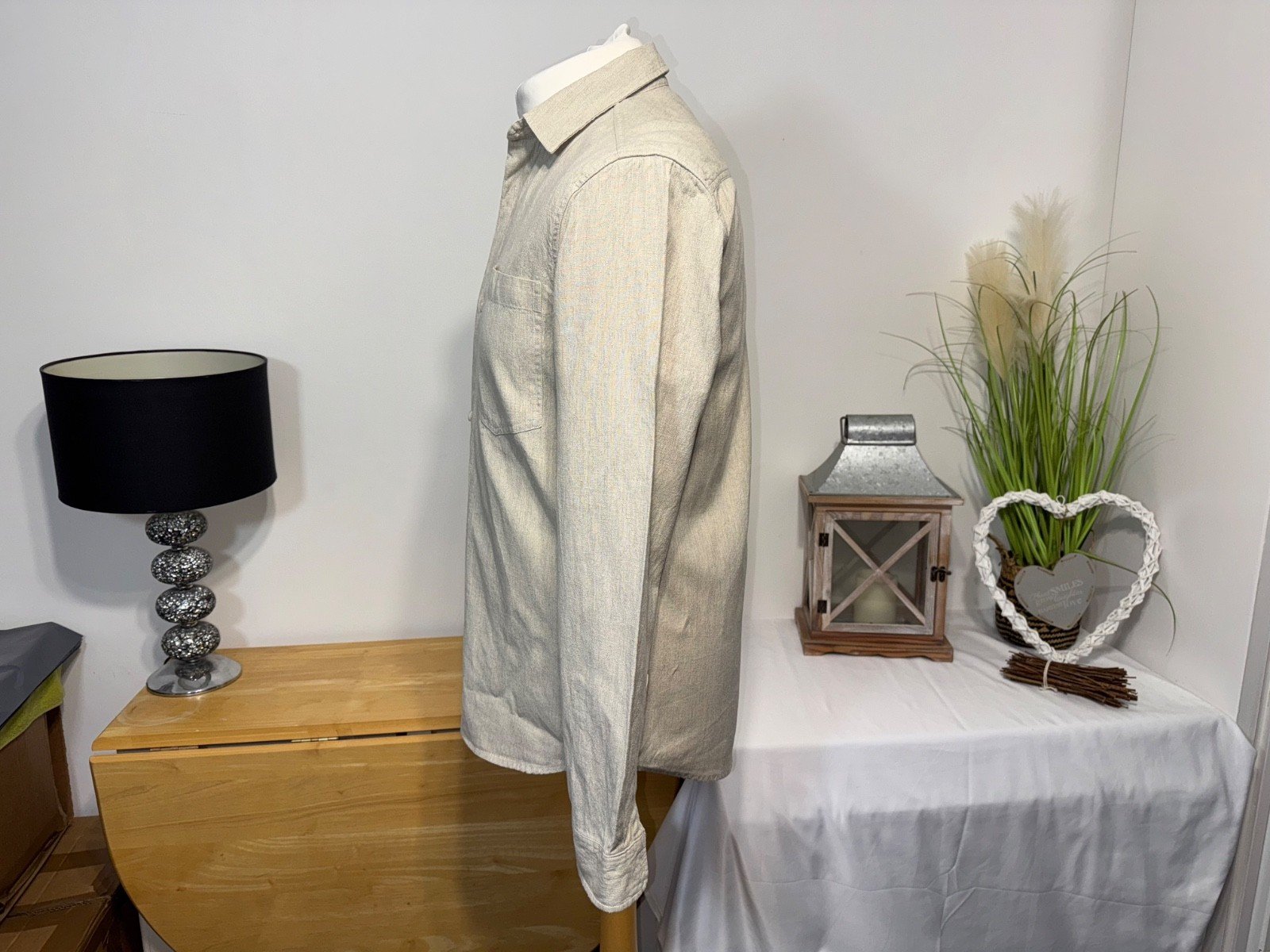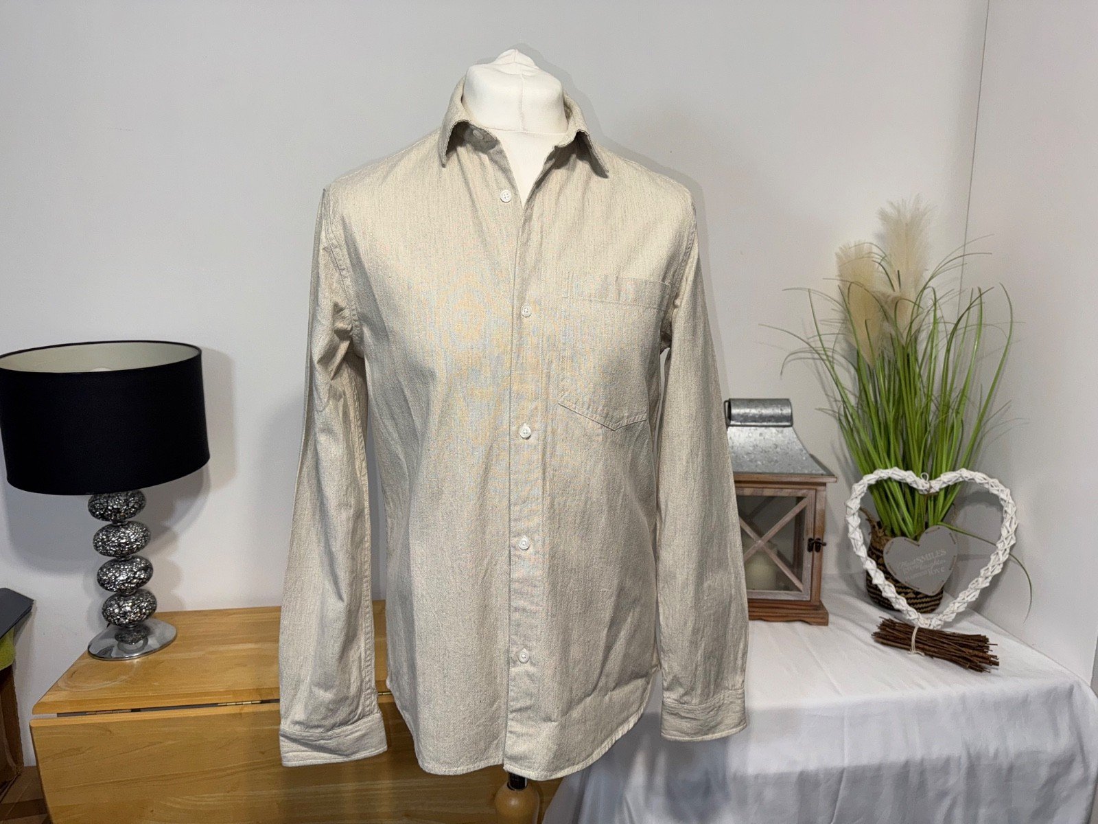 Pit-pit 21in. Length 30inThe River Island Stone Linen Blend Long Sleeve Shirt is a versatile and stylish addition to any man's wardrobe. Made from a comfortable linen and cotton blend, this woven shirt features a collared neckline, button closure, and a regular fit. The classic stone colour makes it suitable for casual occasions throughout the seasons, from autumn to summer. With its long sleeves and subtle button accents, this River Island shirt combines practicality with a touch of sophistication for a timeless and effortless lookRef 2.