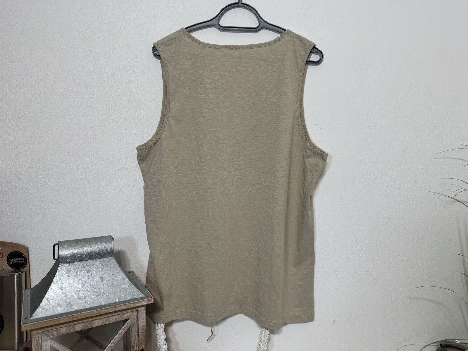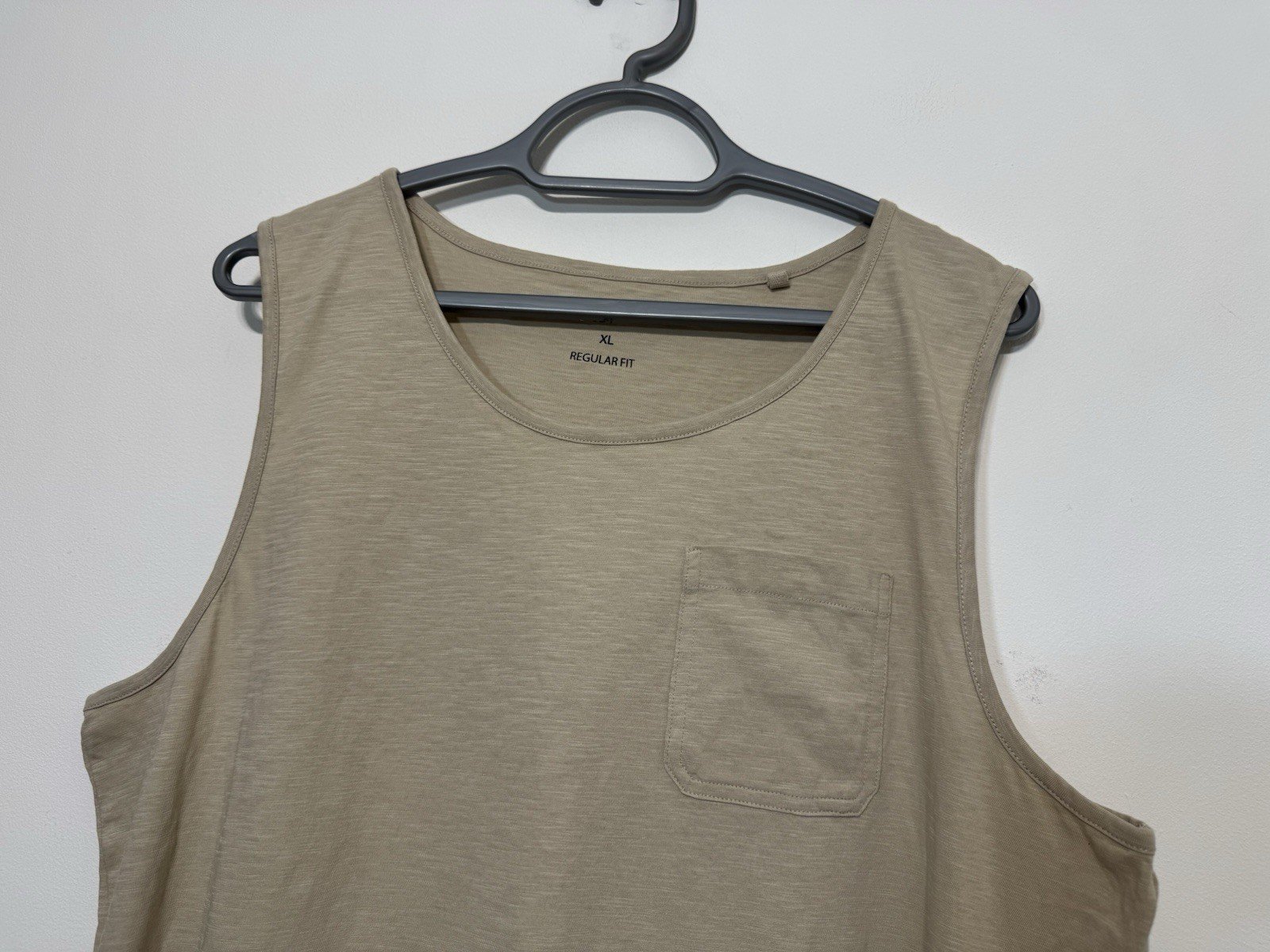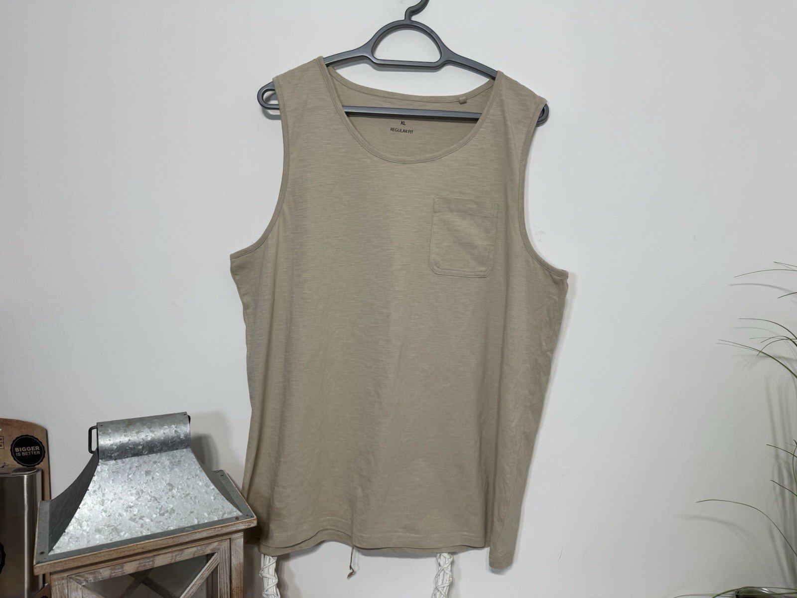 Pit-pit 24”This Stone Cotton Vest Top in size XL is a versatile addition to any man’s wardrobe. Made from comfortable cotton material, it features a sleeveless design with a classic round neck. The solid beige colour adds a subtle touch of style, while the regular fit ensures comfort and ease of movement. Machine washable for convenience, this T-shirt from Tu is perfect for everyday wear and can be easily paired with shorts or jeans for a casual look.