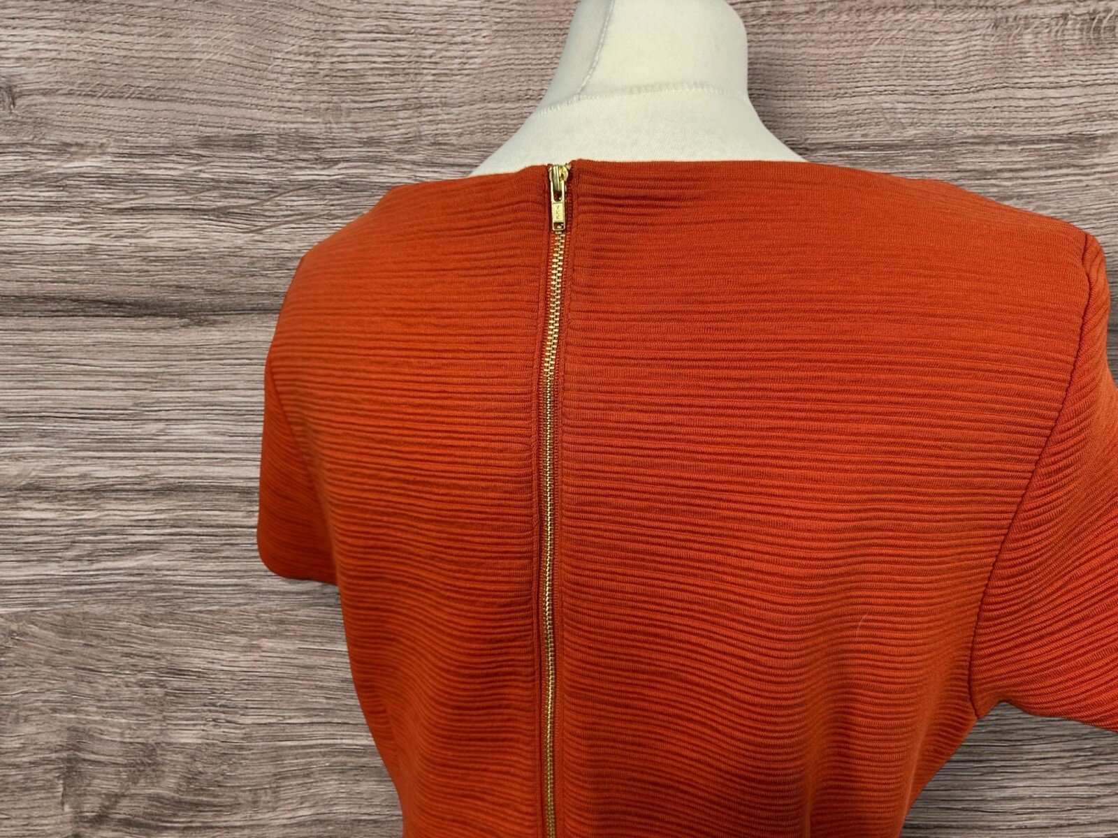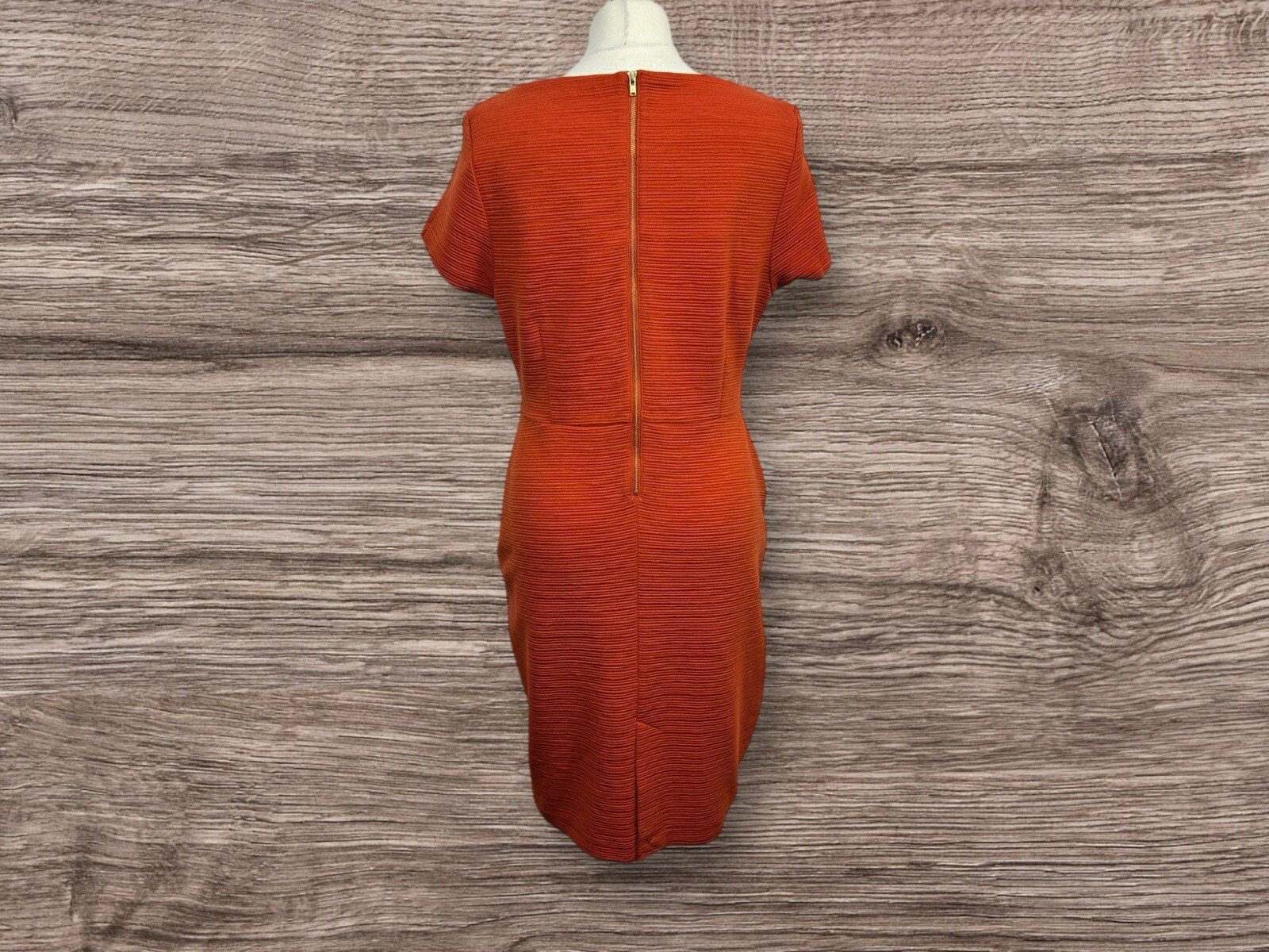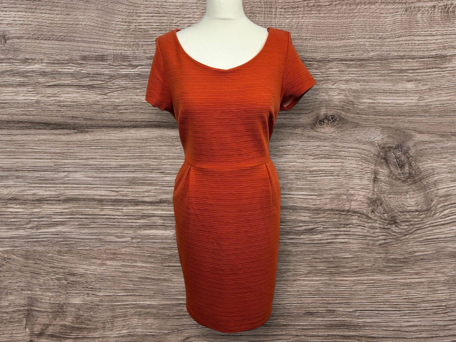 Elevate your style with this stunning Tu Rust Textured Pencil Dress. The dress features a scoop neckline, short sleeves, and a back zip closure. The darted waistline and pockets add a touch of sophistication to the overall design. The dress is made of a blend of polyester, viscose, and elastane, making it comfortable to wear while maintaining its shape. This dress is perfect for any occasion, whether it's a formal event or a night out with friends. The rust colour adds a pop of elegance to your wardrobe. The dress is a size 14 and fits regular size women. Don't miss out on the chance to own this beautiful dress from the Tu brand. Pit-pit 19.5in. Length 37in Excellent condition Whilst every care is taken to ensure the garments are checked to a high standard and most are in As New Condition. However they are used garments and therefore may show some small signs of wear.