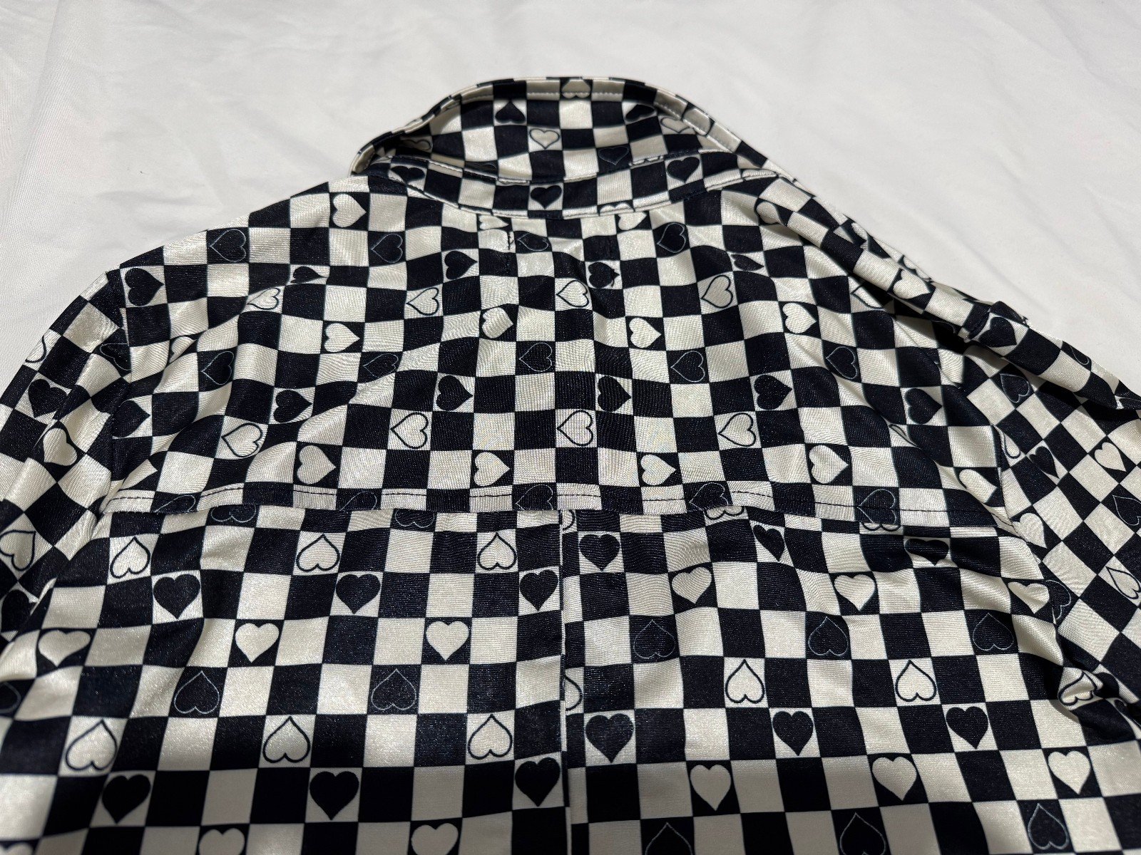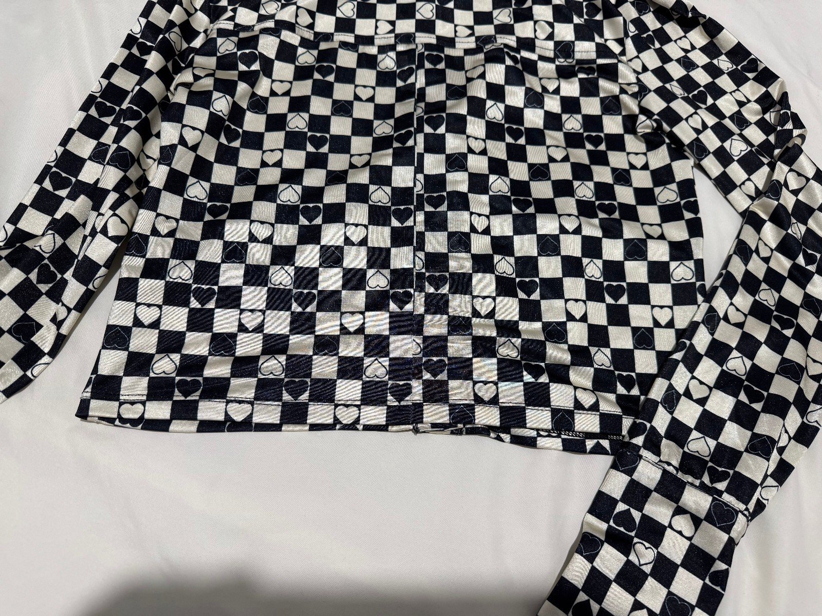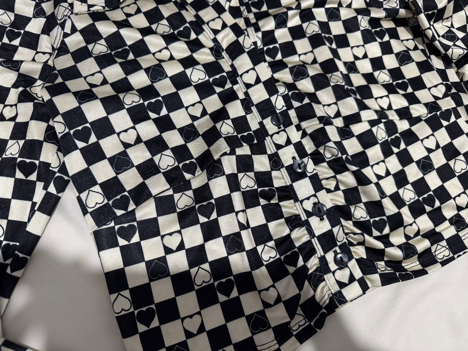 The Urban Outfitters Heart Detail Crop Blouse in size 8-10 is a stylish and versatile addition to any woman’s wardrobe. This black ivory blouse features long sleeves, a collared neckline, and button closure, perfect for a casual or smart-casual look. Made from a comfortable blend of polyester and elastane, this blouse is easy to care for with machine washable instructions. With its cropped style and regular fit, this blouse by Urban Outfitters is a chic choice for any occasion.