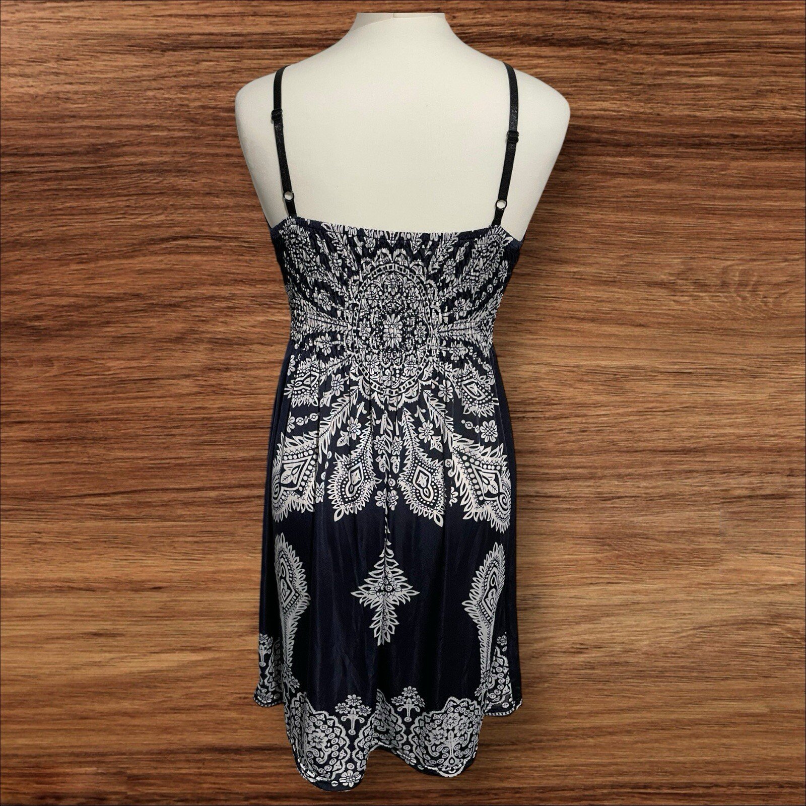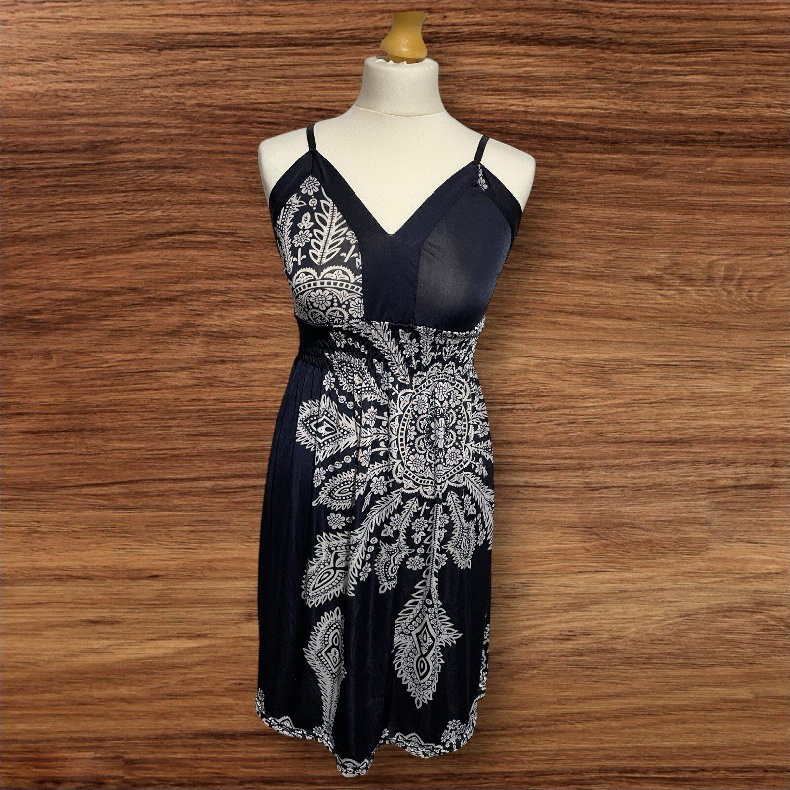This beautiful slip dress is perfect for any occasion. The dark blue colour is complemented by the white pattern, creating a stylish and elegant look. The knee-length dress is designed for women, with a regular size type and size 10. The brand is White, and the dress falls under the categories of Dresses, Women's Clothing, Women, and Clothes, Shoes & Accessories. The dress is perfect for any woman looking for a comfortable yet stylish piece to wear to work or a night out. From a smoke and pet free home