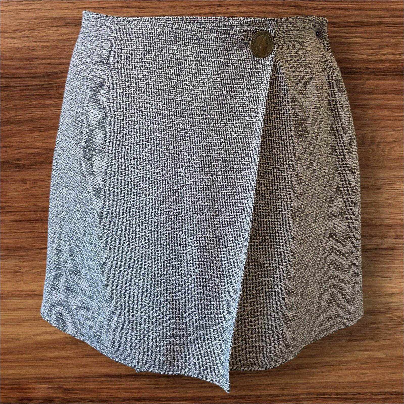Elevate your wardrobe with this stylish Pimkie skirt in black and white. The textured material and lined features provide comfort and a flattering fit for any occasion. The wrap style and short length create a trendy and fashionable look, perfect for any fashion-forward woman. This skirt is designed with a button closure and is a size 8, suitable for regular size types. The skirt is ideal for any woman looking for a versatile addition to their wardrobe, perfect for both casual and formal occasions. Don't miss out on the opportunity to add this must-have piece to your collection. Excellent condition From a smoke and pet free home